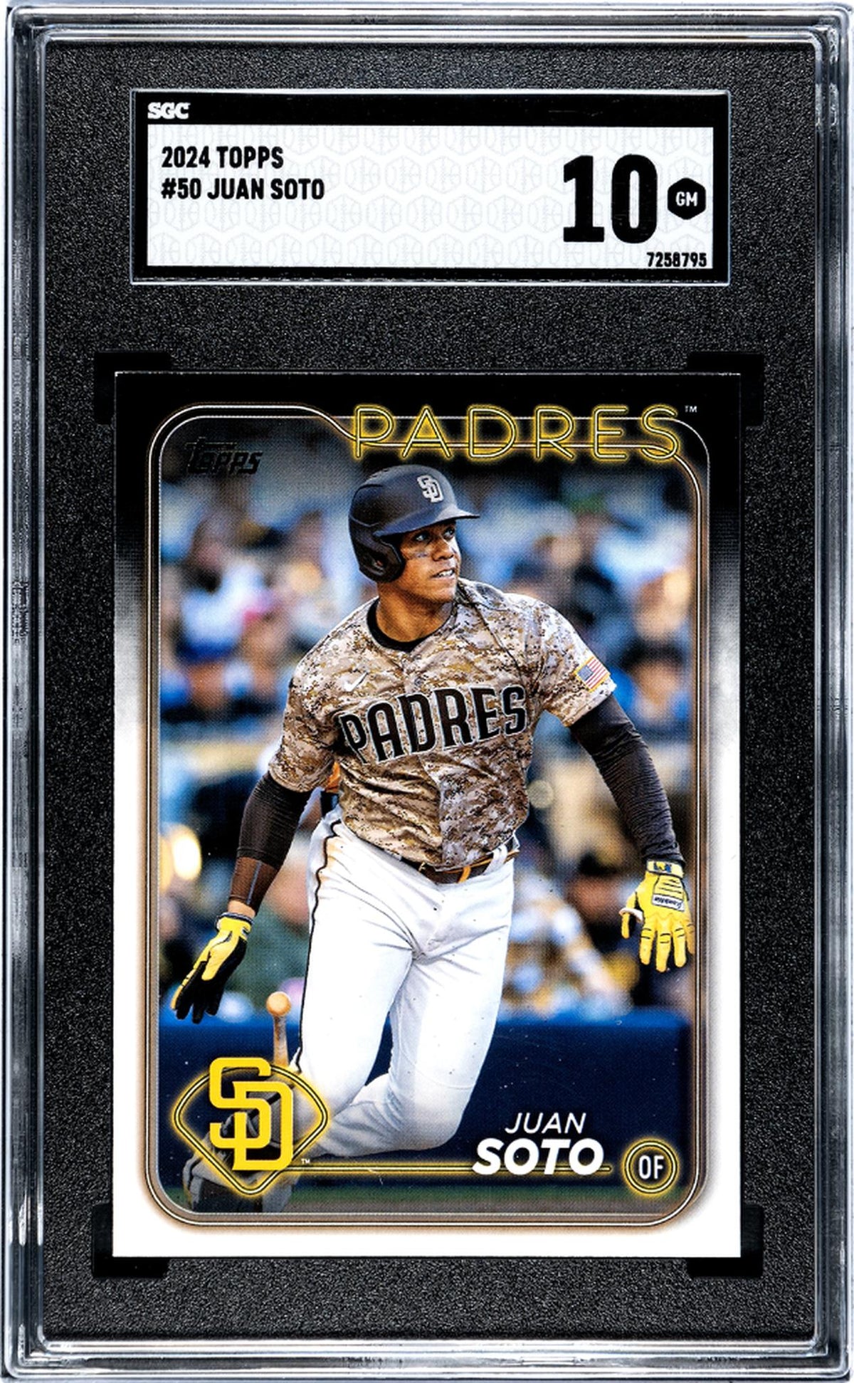 Behold this magnificent 2024 Topps #50 Juan Soto card, a true gem for all discerning baseball card collectors. Crafted by the renowned manufacturer, Topps, this card is a testament to the exceptional quality and detail they are recognized for. Graded a perfect 10 by SGC, this card is in 'Gem Mint' condition, the pinnacle of card grading, assuring you of its immaculate condition and supreme value.