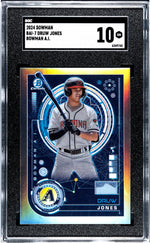 Step into the future with this exquisite 2024 Bowman BAI-7 Druw Jones Baseball card, a stellar addition to any sports card collection. Manufactured by the industry-leading Topps and hailing from the esteemed Bowman brand, this card exudes quality and prestige.