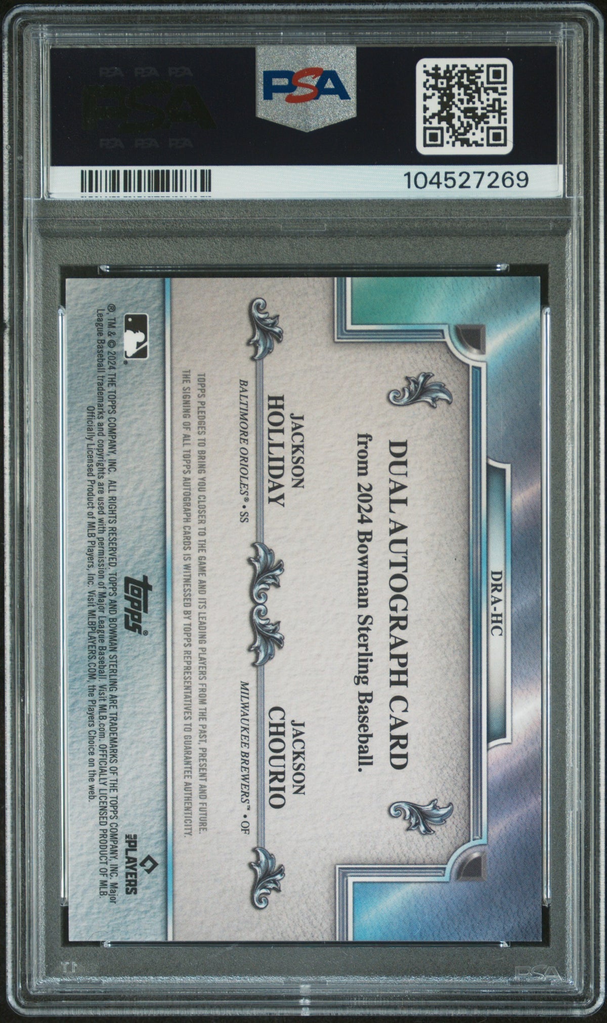 This 2024 Bowman Sterling DRA-HC Holliday/Chourio card is more than just a baseball card - it's a piece of sports memorabilia that encapsulates the spirit of the game. The impressive features like the rare serial number, dual on-card autographs, and the Mint 9 grade by PSA make this card highly sought after.