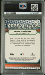 The key features of this card include its inclusion in the 'Best Ballers' insert set, its pristine Gem Mint 10 condition, and the fact that it represents the early days of Jasson Dominguez's career with the New York Yankees in the MLB.