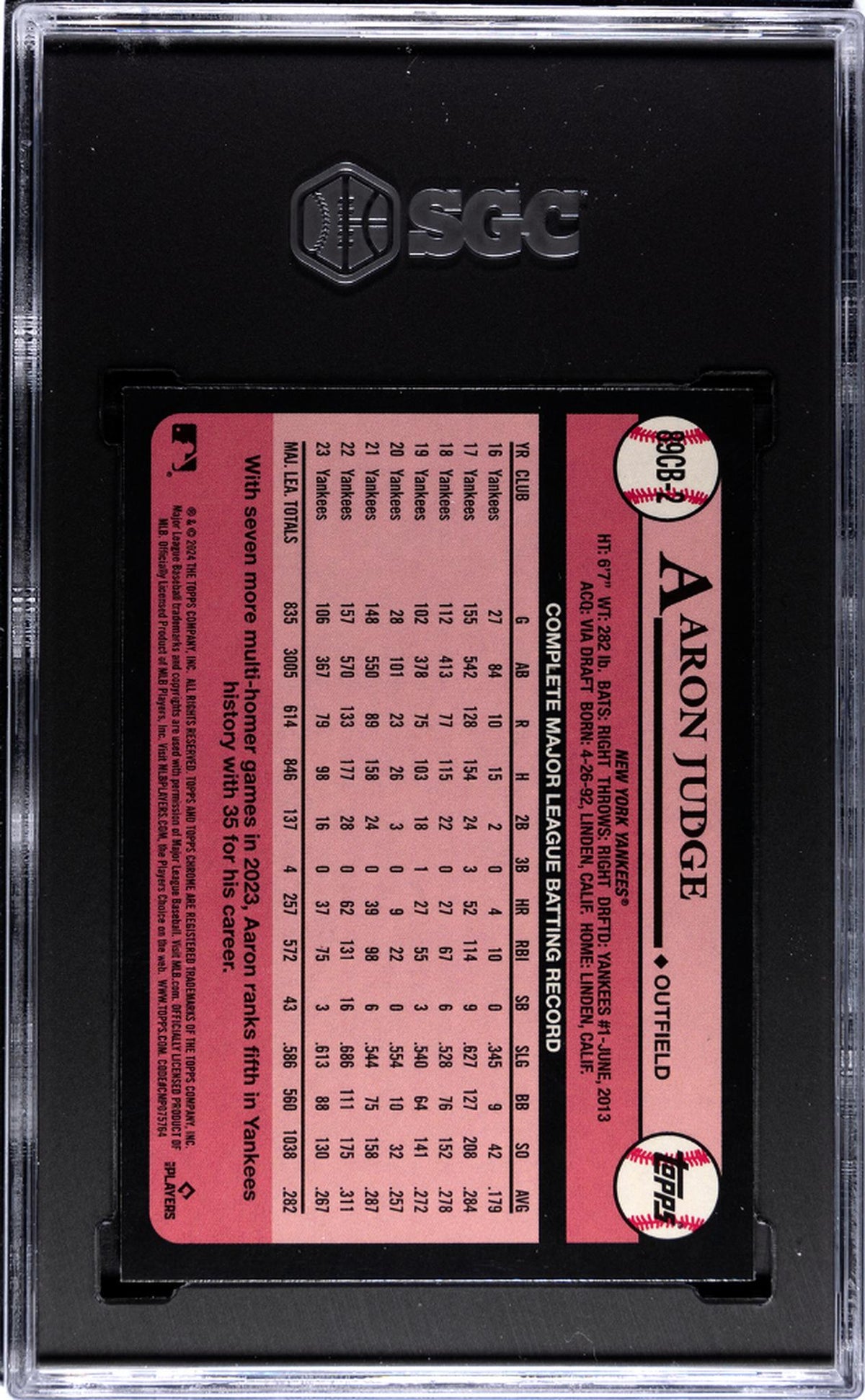 Feast your eyes on this splendid 2024 Topps Chrome Baseball card, featuring the remarkable Yankees' superstar, Aaron Judge. Produced by the reputable Topps brand, this card is beautifully presented in the iconic '89 Topps Design, a nod to the classic era of baseball cards that nostalgic collectors and modern enthusiasts alike find irresistible. This card is not just another piece; it is a gem mint, with an impeccable grade of 10 from the esteemed SGC grading company, assuring its pristine condition and top-notch quality. The card is professionally graded, ensuring its authenticity and condition are beyond reproach, making it a valuable addition to any collection. The card showcases Aaron Judge, a player who has redefined the game with his incredible skill and undeniable talent. His dynamic play for the Yankees in the MLB league has secured his place in baseball history, and this card perfectly encapsulates his on-field prowess. Although it's not a rookie card, its value is undiminished because of the player it represents. Please note that this card is a part of the 2024 Topps Chrome Set, a sought-after collection that combines modern design elements with a touch of nostalgia. It is the 35th-anniversary edition, making it a card of significant interest to collectors around the globe. This Aaron Judge card does not include an autograph or memorabilia, but its charm lies in its simplicity and the player it represents. The card number is 89CB-2, and it's a standard card, not a parallel or serial numbered. Whether you are an avid Yankees fan, a die-hard Aaron Judge follower, or simply a lover of beautifully designed sports cards, this 2024 Topps Chrome 89CB-2 Aaron Judge SGC 10 card is a must-have piece for your collection. With its outstanding features, it is certain to be a conversation starter and a treasure to be admired for years to come.