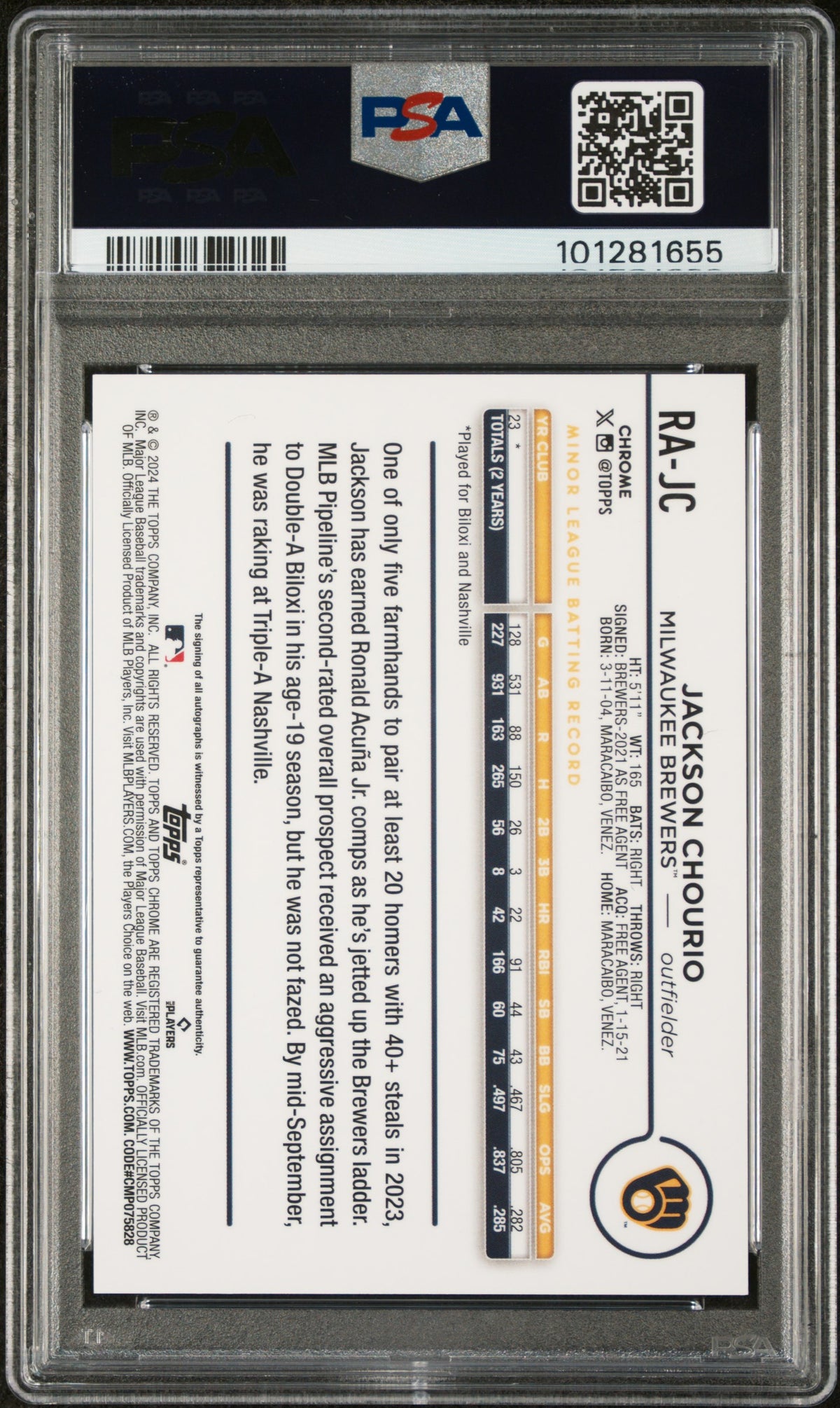 Make room in your collection for this magnificent card. Its visual appeal, rarity, and perfect condition make it an investment that you can flaunt proudly. This is more than just a sports card; it is a piece of sports history. Add this 2024 Topps Chrome RAJC Jackson Chourio card to your collection today and enjoy the prestige it brings.