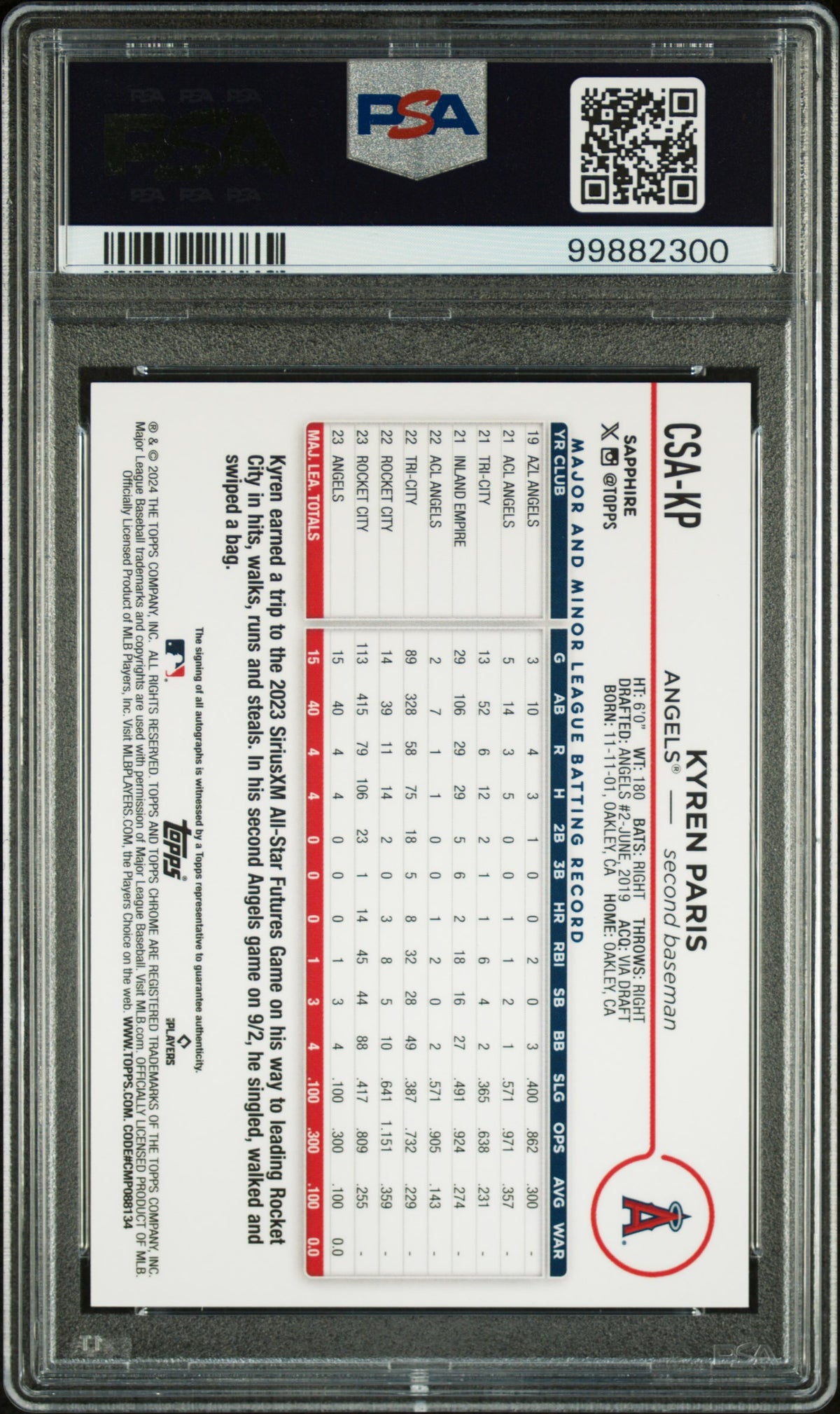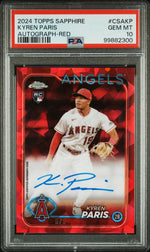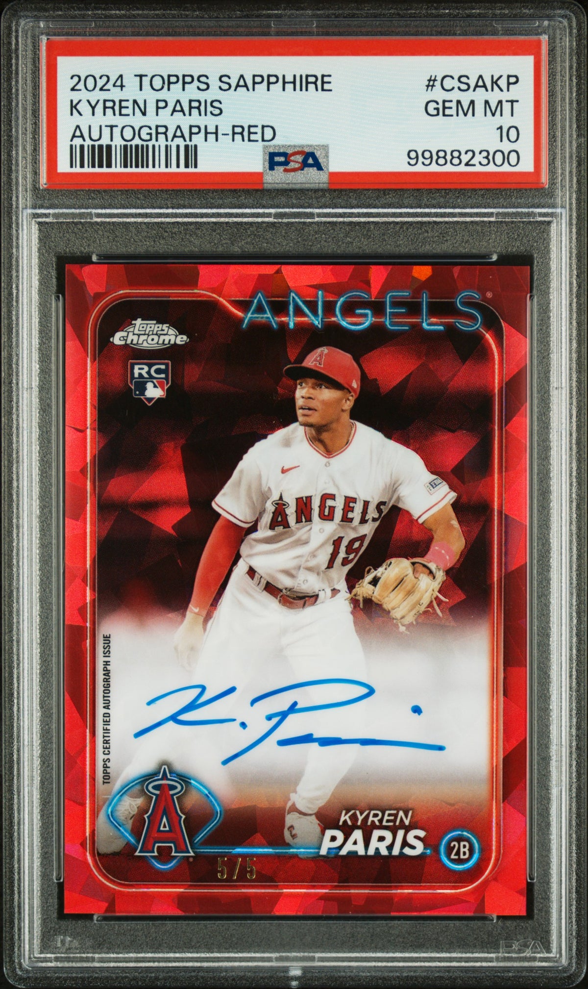 Stepping into the spotlight, we present you with an exquisite piece of baseball history, a 2024 Topps Chrome Sapphire Kyren Paris Red Auto PSA 10 card. This is a must-have for any serious sports card collector. This enthralling card features the young and dynamic player, Kyren Paris of the Angels, gloriously captured in his rookie year. This makes the card not just a collectible, but a tangible piece of his early career.
