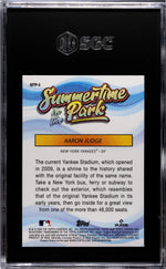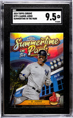 Introducing the spectacular 2024 Topps Chrome SITP-3 Aaron Judge card from the renowned 'Summertime in the Park' insert set. This card showcases the New York Yankees' superstar, Aaron Judge, one of the most formidable players in the MLB, in his prime.
