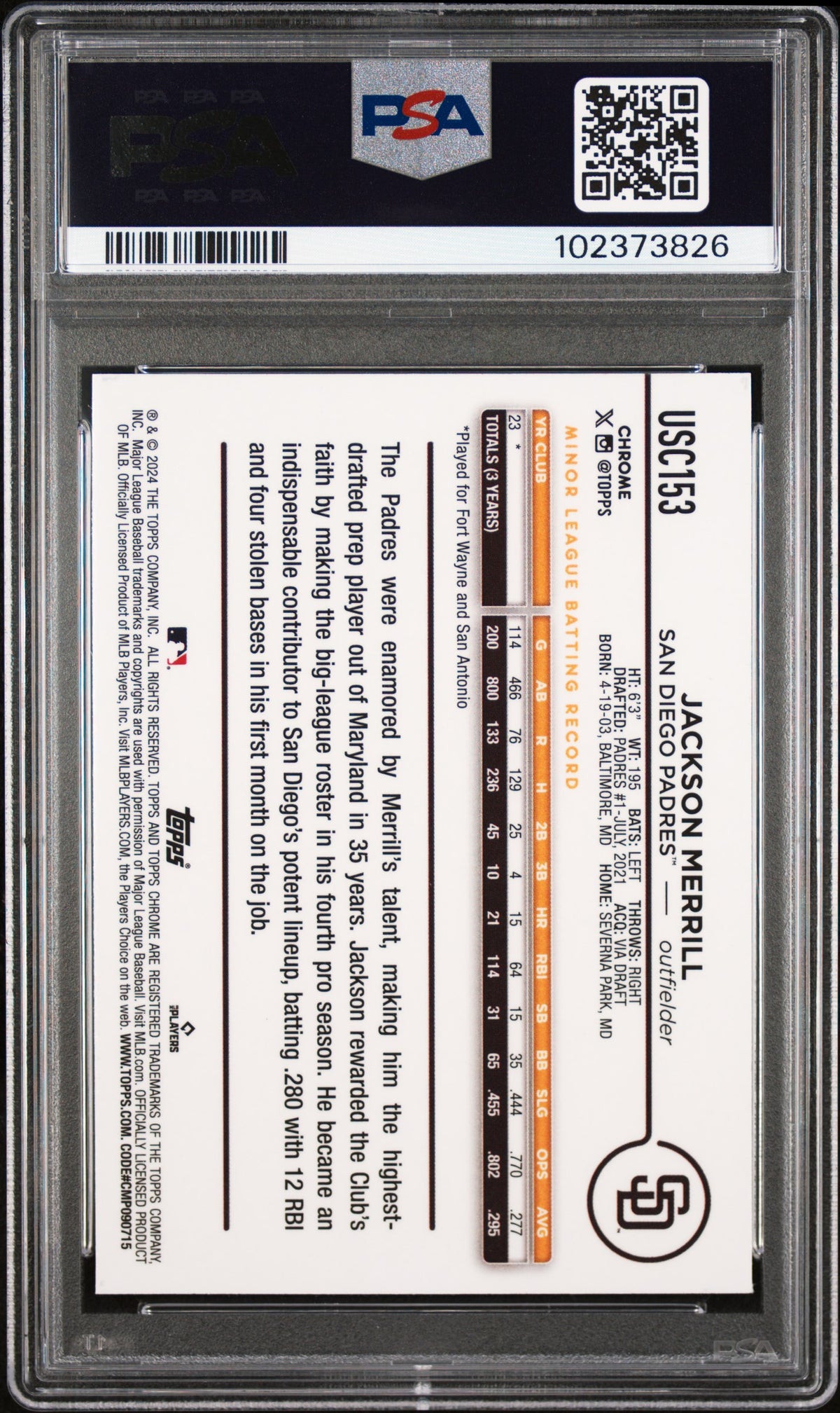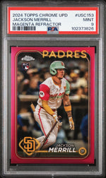 Step up your sports card collection game with this exceptional 2024 Topps Chrome USC153 Jackson Merrill Rookie card, a definite show-stopper! Manufactured by the renowned Topps, it's part of the much-coveted 'Topps Chrome Magenta Refractor' set, recognized for its premium quality and stunning design.