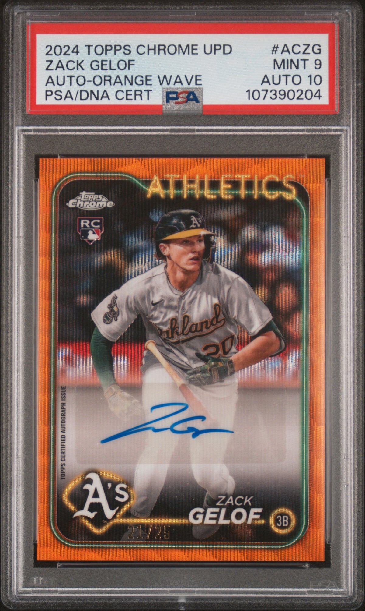 Introducing the stunning 2024 Topps Chrome AC-ZG, featuring the talented Zack Gelof of the Oakland Athletics. This MLB rookie card is not just a card, but a coveted piece of sports history. Manufactured by the renowned Topps company, this card is from the sought-after 'Auto-Orange Wave' set, known for its distinctive and vibrant Orange Wave parallel.