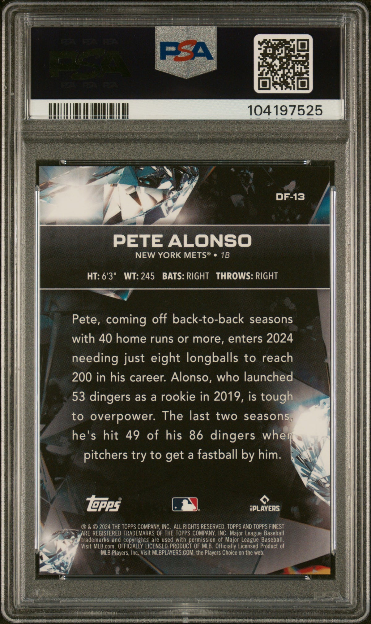 So, whether you're a die-hard New York Mets fan, an admirer of Pete Alonso, a passionate baseball card collector, or simply someone who appreciates the finest things in life, this impeccable card is a worthy addition to your collection. Grab this piece of baseball history today and dive deep into the world of MLB with the 2024 Topps Finest Diamond Finest Pete Alonso card!