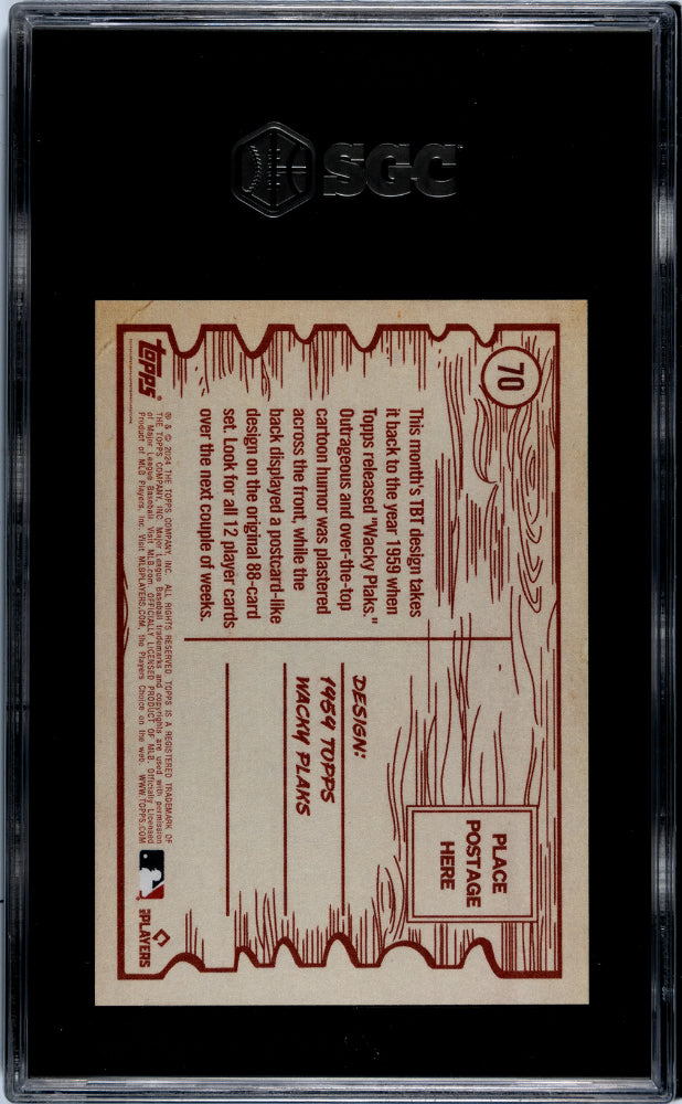 Feast your eyes on this stunning Evan Carter rookie card from the celebrated 2024 Topps TBT set. Manufactured by Topps, the household name in sports collectibles, this card bears the unique and nostalgic design of the 1969 Topps Wacky Plaks, giving it an irresistible blend of modern and vintage appeal. Carter, a rising star in the Texas Rangers and the MLB, is beautifully captured in this card, making it a must-have addition to any serious baseball card collection. This card is not just a tribute to Carter's burgeoning career, but also a testament to the rich legacy of the sport. Adding to its value, this card has been professionally graded by SGC, the trusted authority in card grading. With a gem mint 10 rating, this card is in impeccable condition - a perfect score for a perfect collectible. The card has a robust, satisfying feel to it, a clear indicator of its top-notch quality. This card isn't just a piece of cardboard, it's a piece of history, capturing the early promise of Evan Carter's career. Whether you're a Texas Rangers fan, a rookie card collector, or simply a lover of baseball, this card will be the star of your collection. With its beautiful design, professional grading, and the rising fame of Evan Carter, this card is more than just a collectible, it is an investment in the future of baseball. Attractively presented and professionally graded, this Evan Carter rookie card perfectly combines the nostalgia of past baseball eras with the excitement of today's game. Don't miss your chance to own this piece of baseball history. Grab it now and watch as it appreciates in value and significance in the years to come!