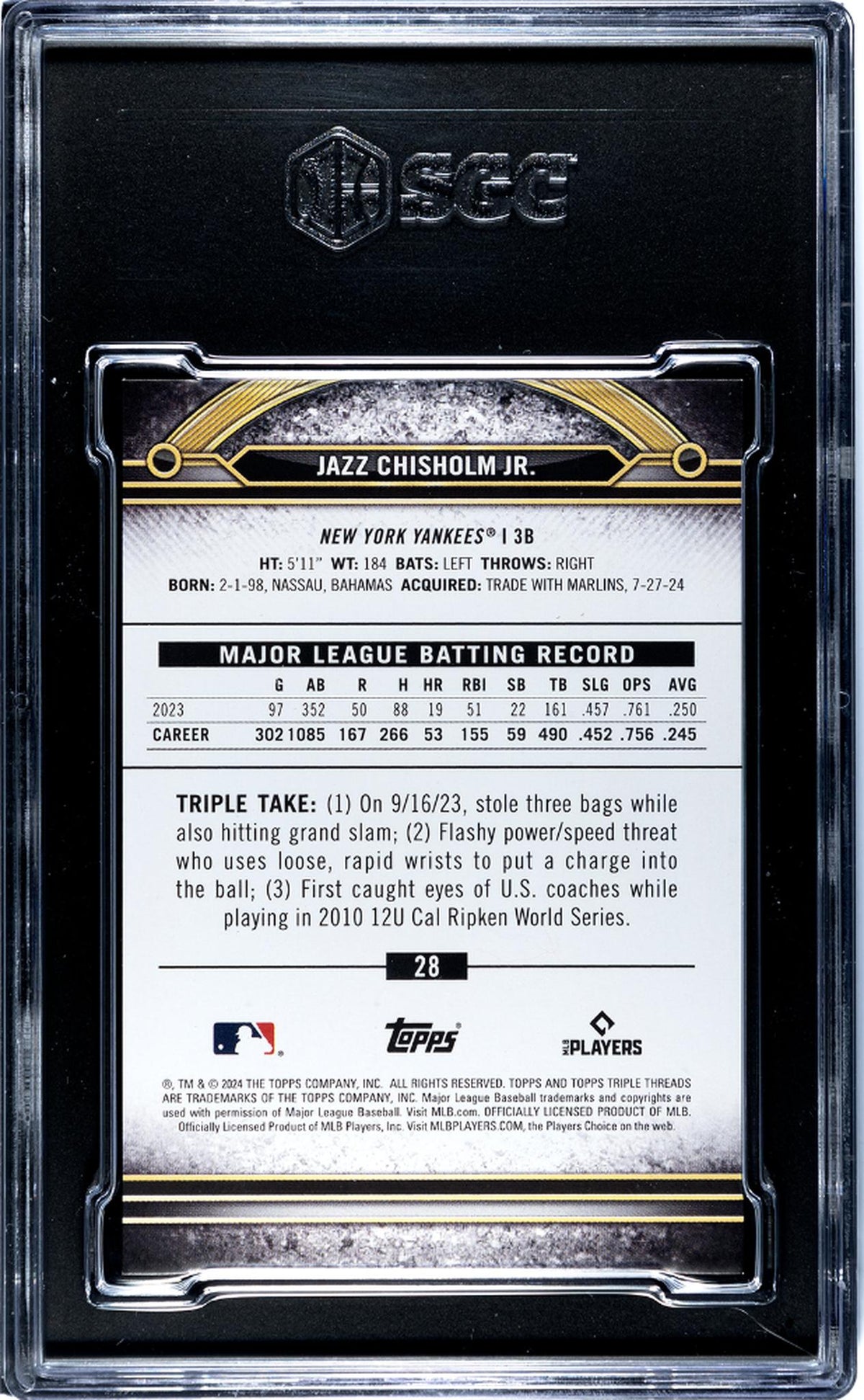Step into the big leagues with this exquisite 2024 Topps Triple Threads Onyx #28 card featuring none other than the talented Jazz Chisholm Jr. of the New York Yankees. This card is a must-have for any dedicated sports card collector or avid Yankees fan. The card is not just any ordinary one, it's a part of the coveted Topps Triple Threads Onyx series and holds a serial number of just 32/50, emphasizing its rarity and exclusivity. What sets this card apart is its impeccable condition. It has been professionally graded by SGC, a reputable name in card grading, and has achieved a high score of 9, fittingly described as 'Mint'. This grade is a testament to the card's outstanding condition and quality, promising a piece that you'd be proud to display in your collection. The card boasts an elegant Onyx parallel finish that adds a unique touch, enhancing its visual appeal. Furthermore, it features the dynamic Jazz Chisholm Jr., an impactful player in the MLB, adding value and significance to this piece. This card is a fine piece of baseball history, a token of Jazz Chisholm Jr.'s contributions to the sport and the New York Yankees. Its rarity, superior condition, and the prestige of the Topps Triple Threads series make it a prized possession. Whether you're an experienced collector or just starting your journey in the world of sports cards, this special Jazz Chisholm Jr. card would make a fine addition to your collection.