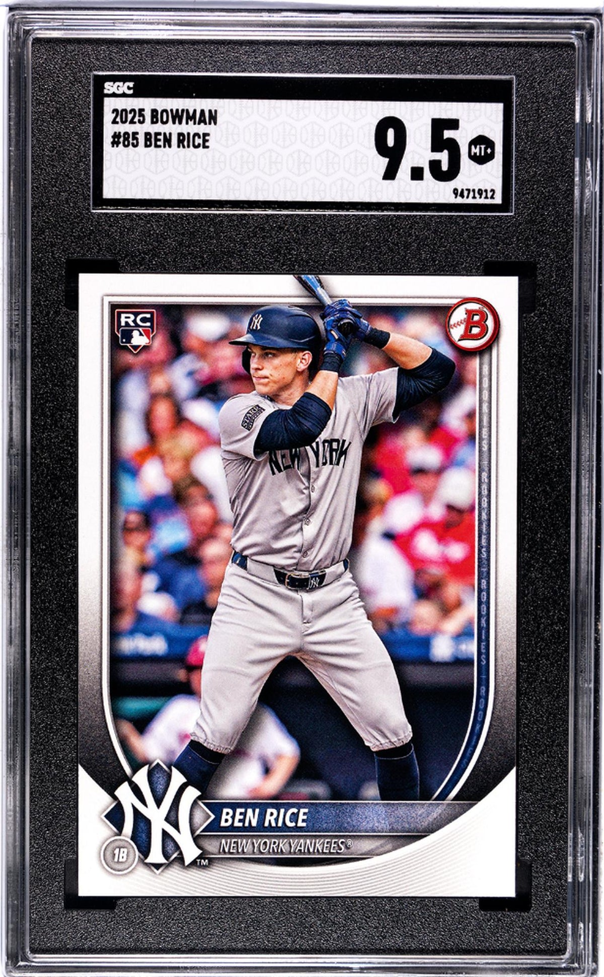 In summary, this 2025 Bowman #85 Ben Rice rookie card stands out for its superior quality, professional grading, distinctive design, and its feature of an exciting player in his rookie year. It's more than just a card - it's a treasure trove of baseball history and a testament to the prowess of Ben Rice. Don't miss the chance to add this gem to your collection!