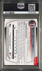 Step into the world of sports card collecting with this exceptional 2025 Bowman CPA-CKE Caden Kendle card, a breathtaking addition to any collection. Manufactured by the renowned Topps and part of the sought-after Bowman series, this card is an epitome of quality and craftsmanship. This rare gem features the promising prospect, Caden Kendle of the Minnesota Twins, captured in the early stages of his career. Notably, this card is from Kendle's rookie year, amplifying its value and appeal. The card is part of the 'Chrome Pros' insert set, known for its extraordinary design and attention to detail. Adding to the uniqueness of this card is its speckle refractor finish. This exclusive feature sets it apart from the crowd and adds a vibrant pop of personality to your collection. With a serial number of 244/299, this card is a limited edition, making it a must-have for passionate collectors. The cherry on top is the player's autograph, making this card a true piece of sports history. The autograph adds a personal touch from the player himself, making the card more intimate and valuable. This card has been professionally graded by PSA, a trusted authority in the world of sports card grading. The card boasts a superb score of 9, indicating it is in mint condition. This high grade assures you of the card's pristine condition and authenticates its quality. From Kendle's powerful presence to the card's striking features, this item is more than just a card; it's a piece of art, history, and an incredible investment. Whether you're a Minnesota Twins fan, a rookie card collector, or a sports card enthusiast, this card is the perfect addition to your collection. Experience the thrill of owning a piece of baseball history with this 2025 Bowman CPA-CKE Caden Kendle card.