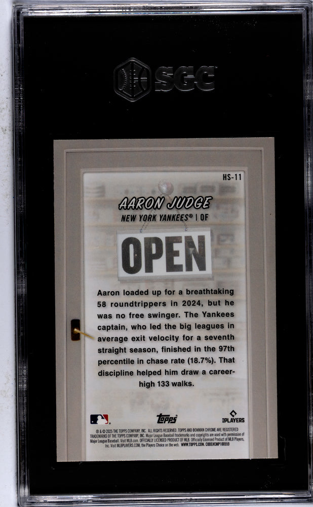 This 2025 Bowman HS-11 Aaron Judge sports card is more than just a card; it's a celebration of baseball, a salute to a remarkable player, and a testament to the joys of collecting. Its key features - the player Aaron Judge, its 2025 Bowman, the Hobby Stars set, its SGC grading of 9.5, its association with the New York Yankees, and its MLB league - all combine to make this card an exciting and worthwhile purchase. Don't miss out on the chance to own this amazing piece of sports history!
