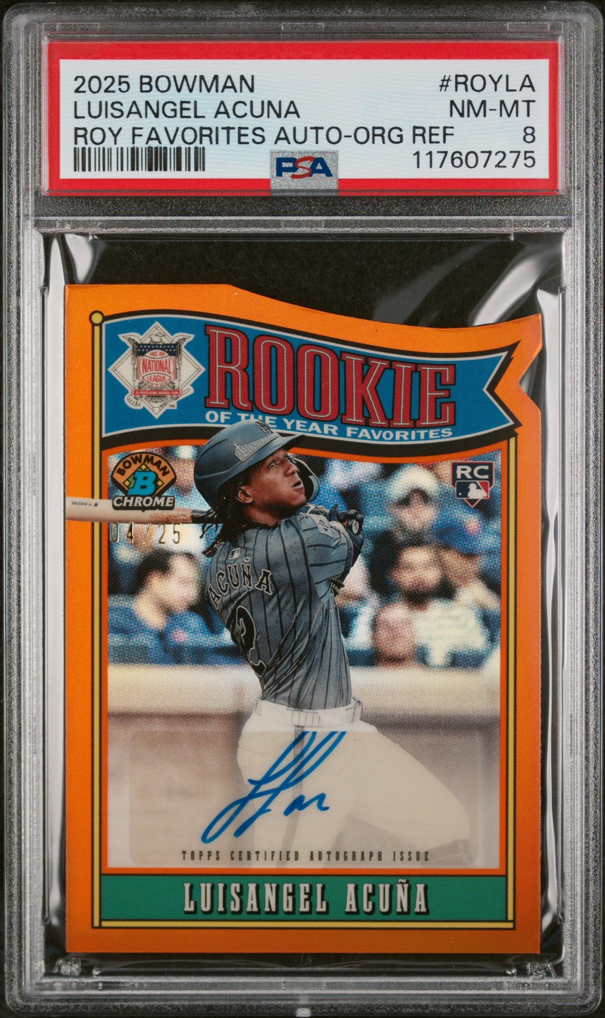 This isn't just any card, it's an Orange Parallel, adding a unique touch to your collection. The card is autographed by Luisangel Acuna himself, making it a personalized piece of sports memorabilia. Adding to its exclusivity, this card is serial numbered 04/25, making it a rare and valuable addition for any serious collector.