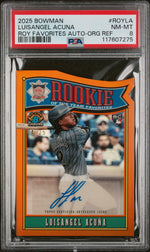 The card is professionally graded by PSA, with a numeric grade of 8, indicating its near-mint to mint condition. It's part of the 2025 Bowman Baseball Card Set, a must-have for any enthusiast. A perfect blend of sports history and collectible art, this card is a testament to Acuna's potential and prowess.