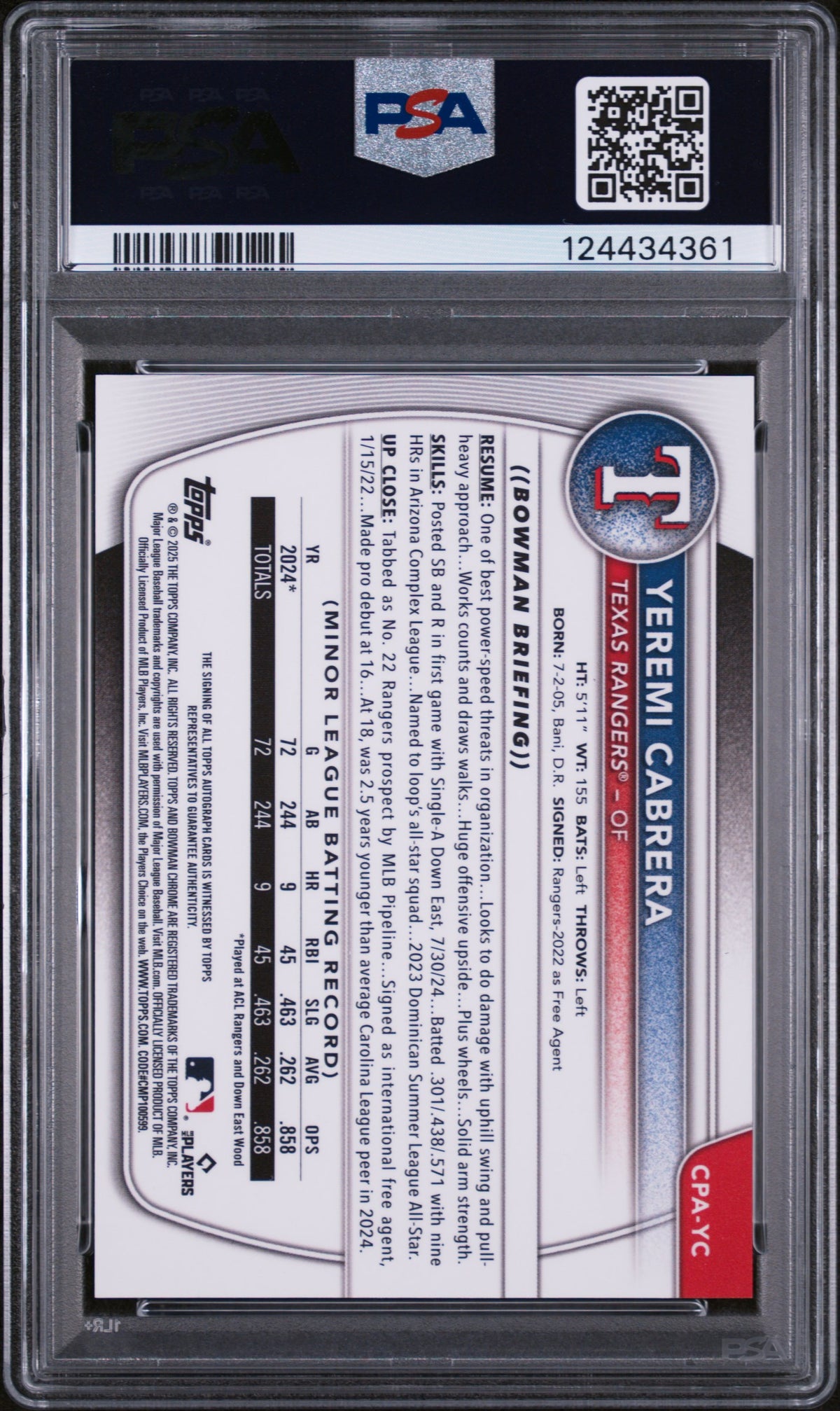 2025 Chrome Prospect Autographs Yeremi Cabrera #CPAYC PSA 10