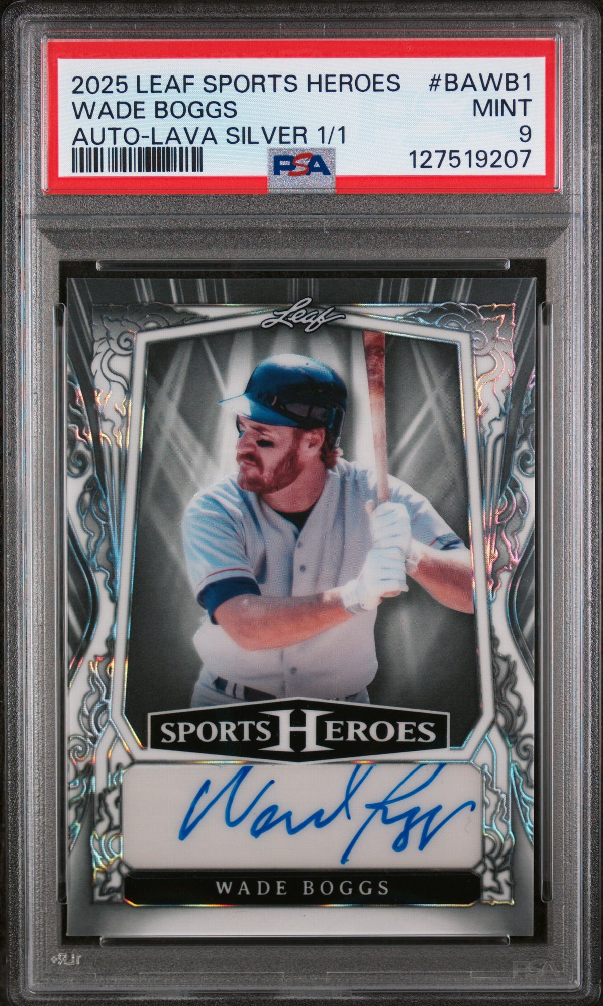 The 2025 Sports Heroes #BAWB1 Wade Boggs card from the Leaf Sports Heroes set is a pinnacle of baseball card collecting. With key features such as its autograph, unique Auto-Lava Silver 1/1 design, and a PSA Mint 9 grading, this card is more than just a collectible; it's a piece of sports history. Whether you're a seasoned collector or a new enthusiast, this card deserves a prime spot in your collection. Rediscover the thrill of collecting with this exceptional Wade Boggs card.