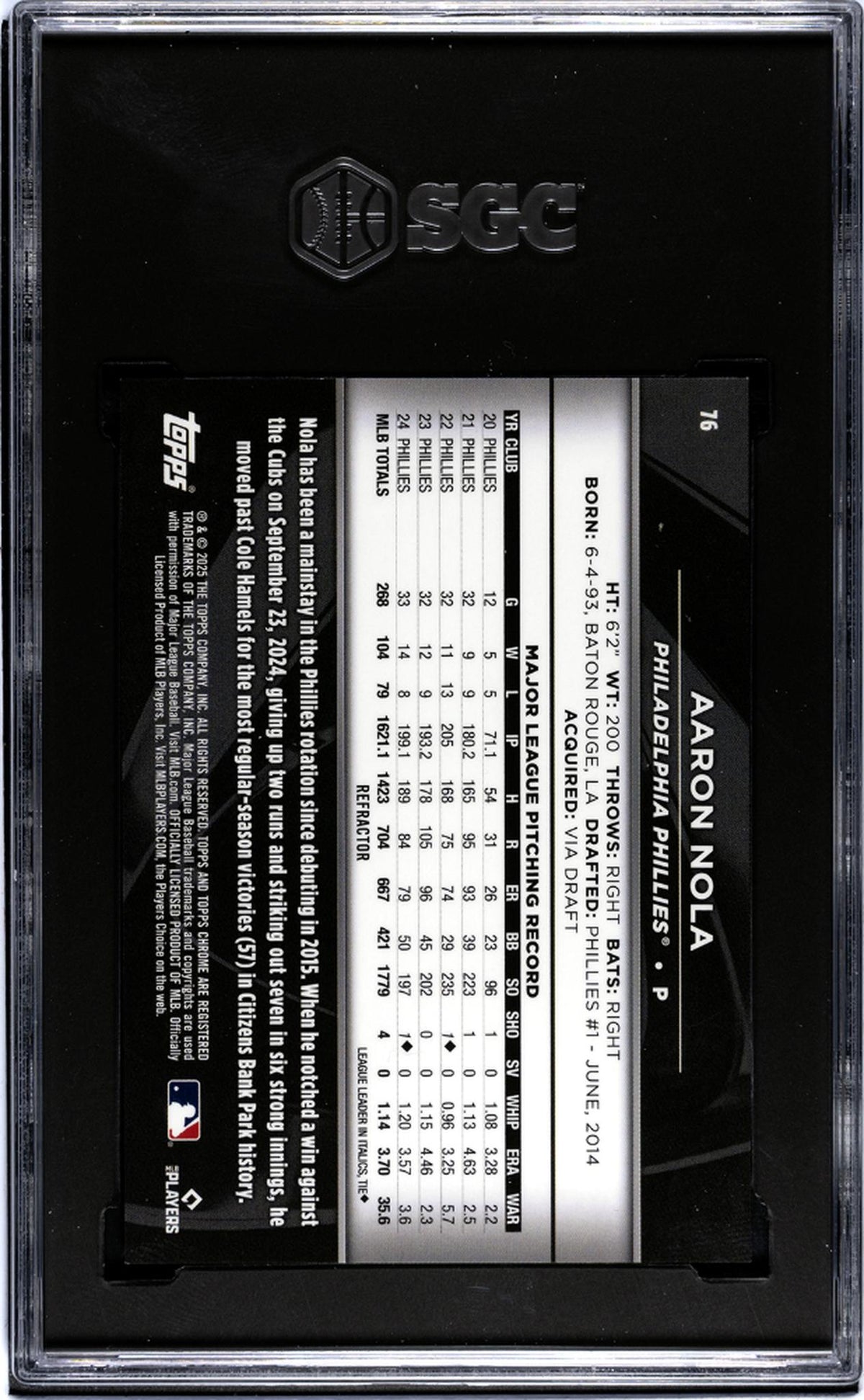 Immerse yourself in the world of Major League Baseball with this captivating Topps Chrome Black Card of the outstanding player, Aaron Nola. This card, a part of the illustrious 2025 set, is a true treasure for any Philadelphia Phillies fan or sports card collector.