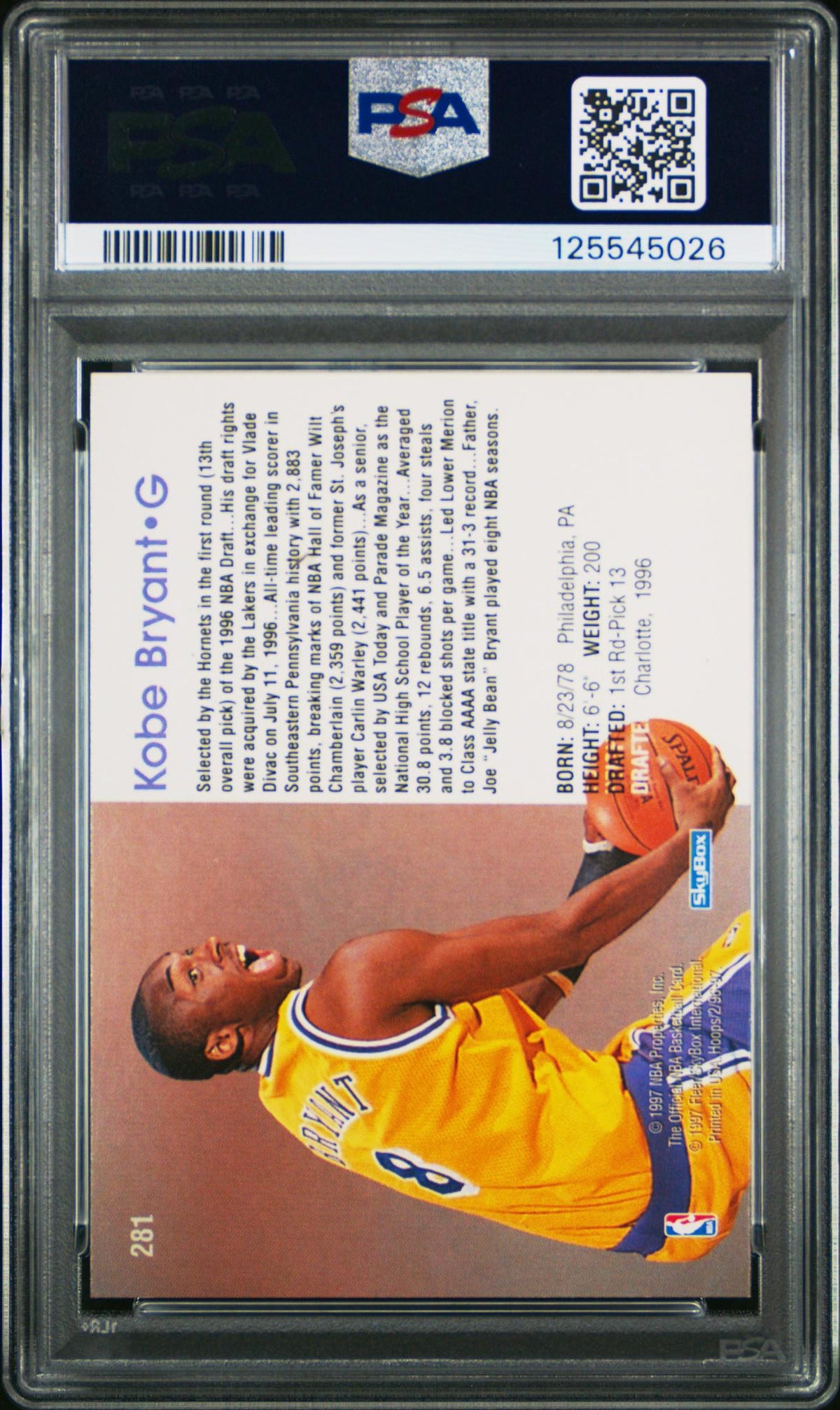 Step into the world of basketball history with this exquisite 1996 Hoops #281 Kobe Bryant Rookie Card! Manufactured by the renowned SkyBox under their popular Hoops brand, this card captures the magic of Bryant's early career with the Los Angeles Lakers in the NBA.