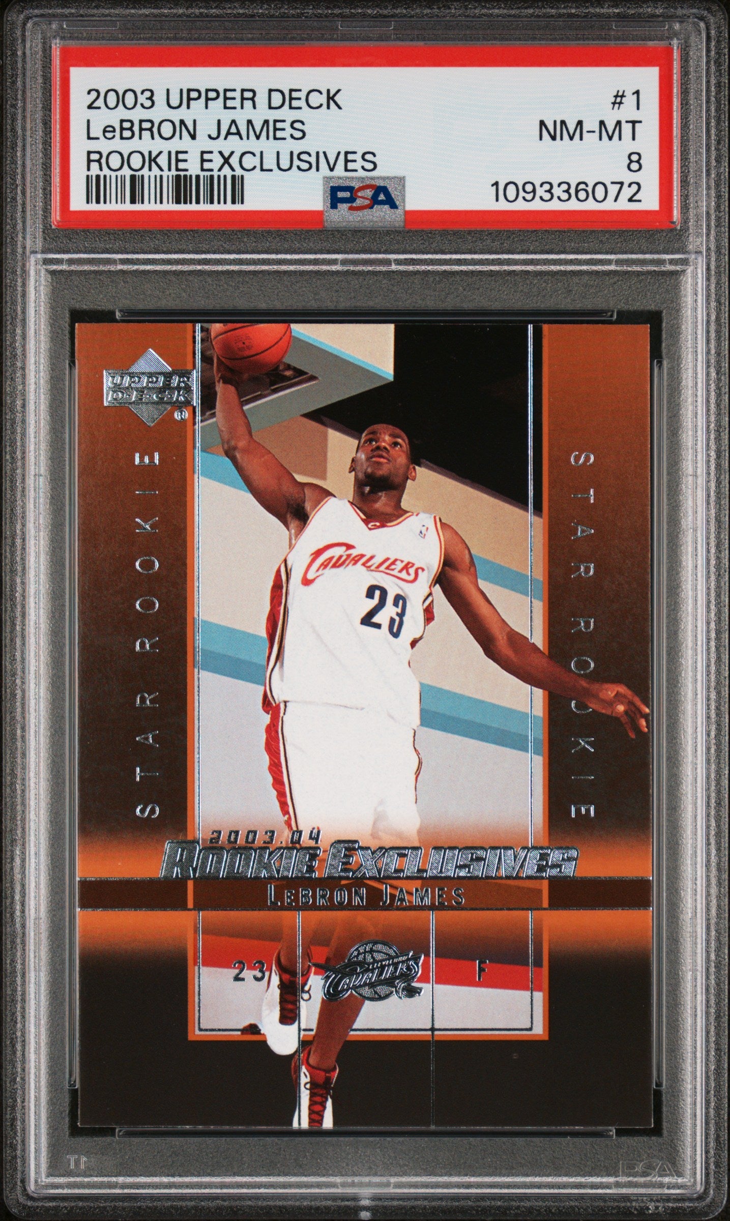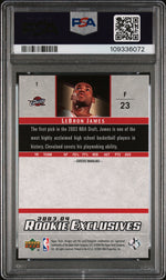 While this card does not include an autograph or memorabilia, its intrinsic value lies in its tribute to LeBron James' rookie year. Its key features include LeBron James' rookie status, its 2003 Upper Deck branding, its PSA 8 grading, its inclusion in the 'Rookie Exclusives' set, and of course, its representation of the NBA legend in his Cleveland Cavaliers jersey.
