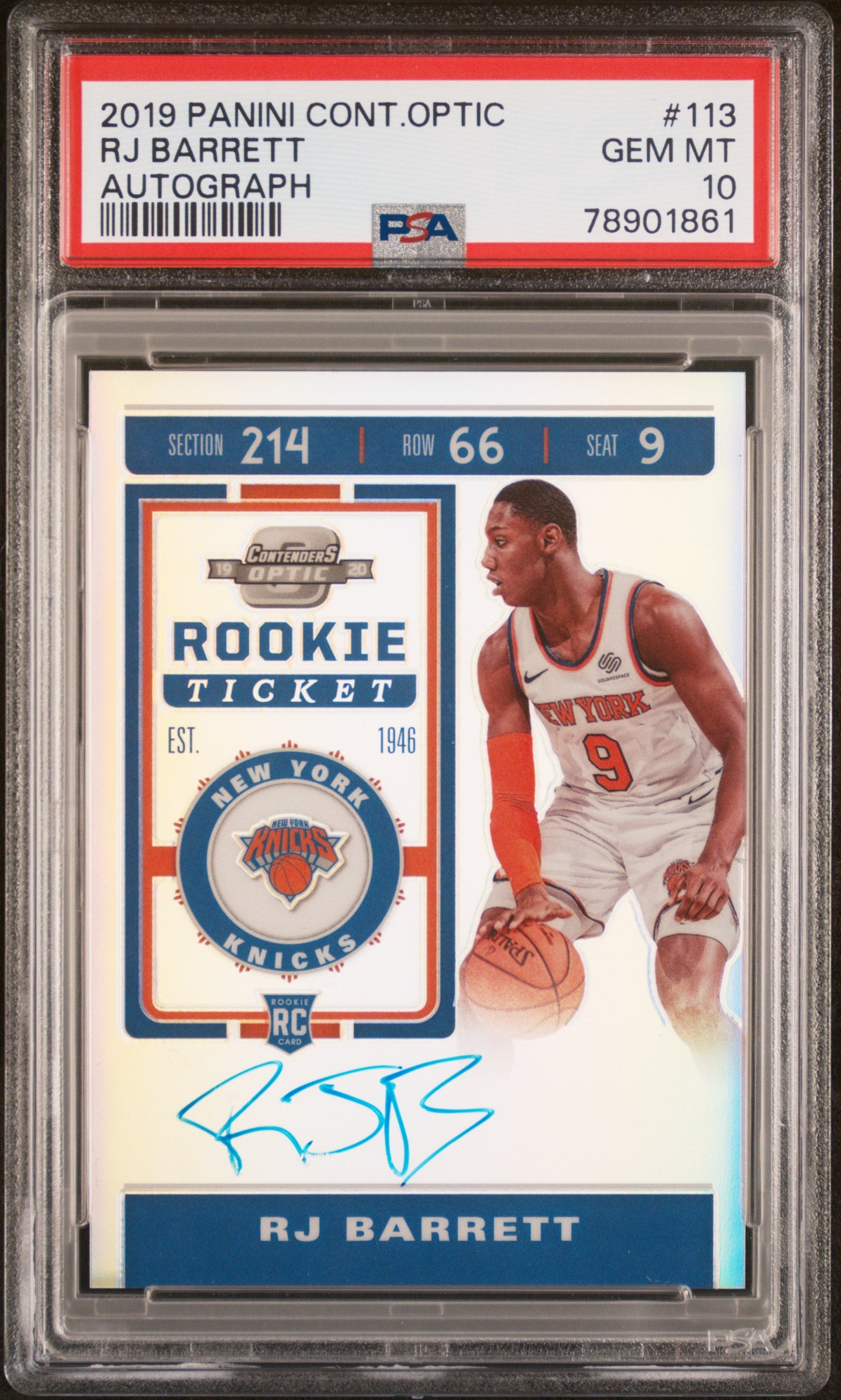 Unveil your love for basketball with this stunning 2019 Panini Contenders Optic RJ Barrett Rookie Ticket Card. This card features the promising talent, RJ Barrett of the New York Knicks, an emerging star who is making his mark in the NBA.