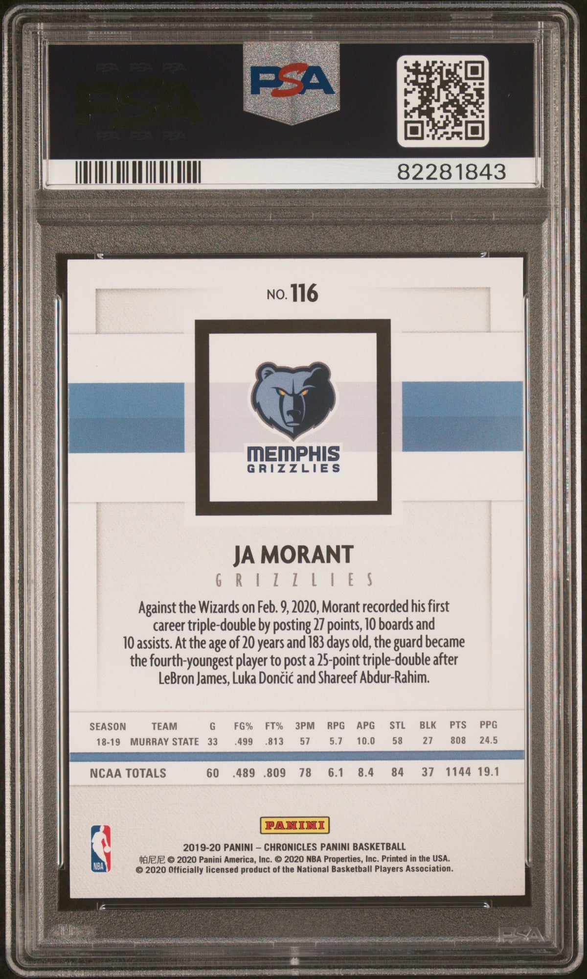 In conclusion, the 2019 Chronicles #116 JA MORANT PSA 10 card is more than just a collectable. It's a piece of basketball history and a tribute to a rising star. Its status as a rookie card, its impeccable condition, and its association with a player of JA MORANT's caliber make it an exceptional find. Don't miss out on the chance to own this extraordinary piece of sports memorabilia.