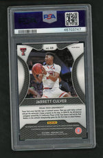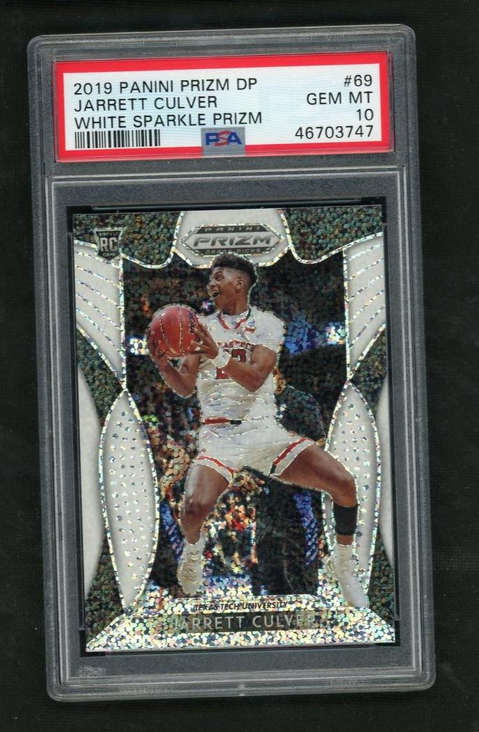 Immerse yourself in the thrill of basketball card collecting with this exceptional 2019 Panini Prizm Draft Picks, Jarrett Culver rookie card. Crafted by esteemed manufacturer Panini under the renowned Prizm brand, this card is an absolute must-have for any serious collector or sports enthusiast. Featuring the prodigious Jarrett Culver from Texas Tech University, this card captures the essence of his promising basketball career at its inception. The card is not merely a piece of cardstock, but a tangible piece of sports history you can hold in your hands. Encased in the stunning White Sparkle Prizm parallel, it exudes a dazzling charm that sets it apart from the crowd. This card isn't just about aesthetic appeal; it's also about quality. Notably, it has been professionally graded by PSA, the trusted name in sports card grading, and has achieved a numeric grade of 10 - a testament to its impeccable condition. The 'Gem Mint' condition description further underscores the immaculate state of this card, making it an ideal addition to any collection. Despite it not being autographed or containing any memorabilia, the value of this card lies in its rarity - a rookie card of this caliber is not something you come across every day. This card represents the pinnacle of sports card collecting, a perfect blend of artistry, sports history, and undeniable quality. So why wait? Add this 2019 Prizm 69 Jarrett Culver PSA 10 to your collection and bask in the prestige and thrill that come with owning a piece of this promising player's journey. Remember, in the world of sports card collecting, it's not just about owning a card; it's about owning a piece of history. This card offers just that - a piece of history encapsulated in a gem mint condition card ready to be admired for years to come.
