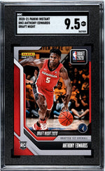 Step into the court with this stunning Anthony Edwards 2020 Panini Instant DN3 card. Manufactured by the respected Panini and part of the exclusive 'Draft Night' set, this card is a testament to one of the NBA's rising stars. Anthony Edwards, a shining talent of the Minnesota Timberwolves, is beautifully showcased in this collectible item, making it a must-have for any sports card enthusiast. The card boasts of an SGC grade of 9.5, indicating its near-perfect mint+ condition. The grading by SGC, a trusted name in the industry, adds another layer of credibility and desirability to this card. This impeccable grading underscores the card's quality and its excellent preservation, making it a standout piece in any collection. Aside from its quality, the card's appeal is also enhanced by its Draft Night insert, a feature that celebrates the momentous event of a player's official entry into the league. As a rookie card, it captures Anthony Edwards at the start of his professional journey, making it a historical memento as well as a valuable collectible. Designed with the fine details and quality that Panini is known for, this card is an embodiment of the spirit and excitement of basketball. Whether you're a fan of Anthony Edwards, a Minnesota Timberwolves supporter, or just a basketball enthusiast, this card is a splendid addition to your collection. It's not just a sports card, it's a slice of NBA history that you can own. This Anthony Edwards card is a tangible piece of the sport's culture and a symbol of a player's potential and talent. It's not just about owning a card, it's about being part of the game, the player's journey, and the entire NBA story. Add this to your collection and enjoy the thrill of owning a piece of sports history.