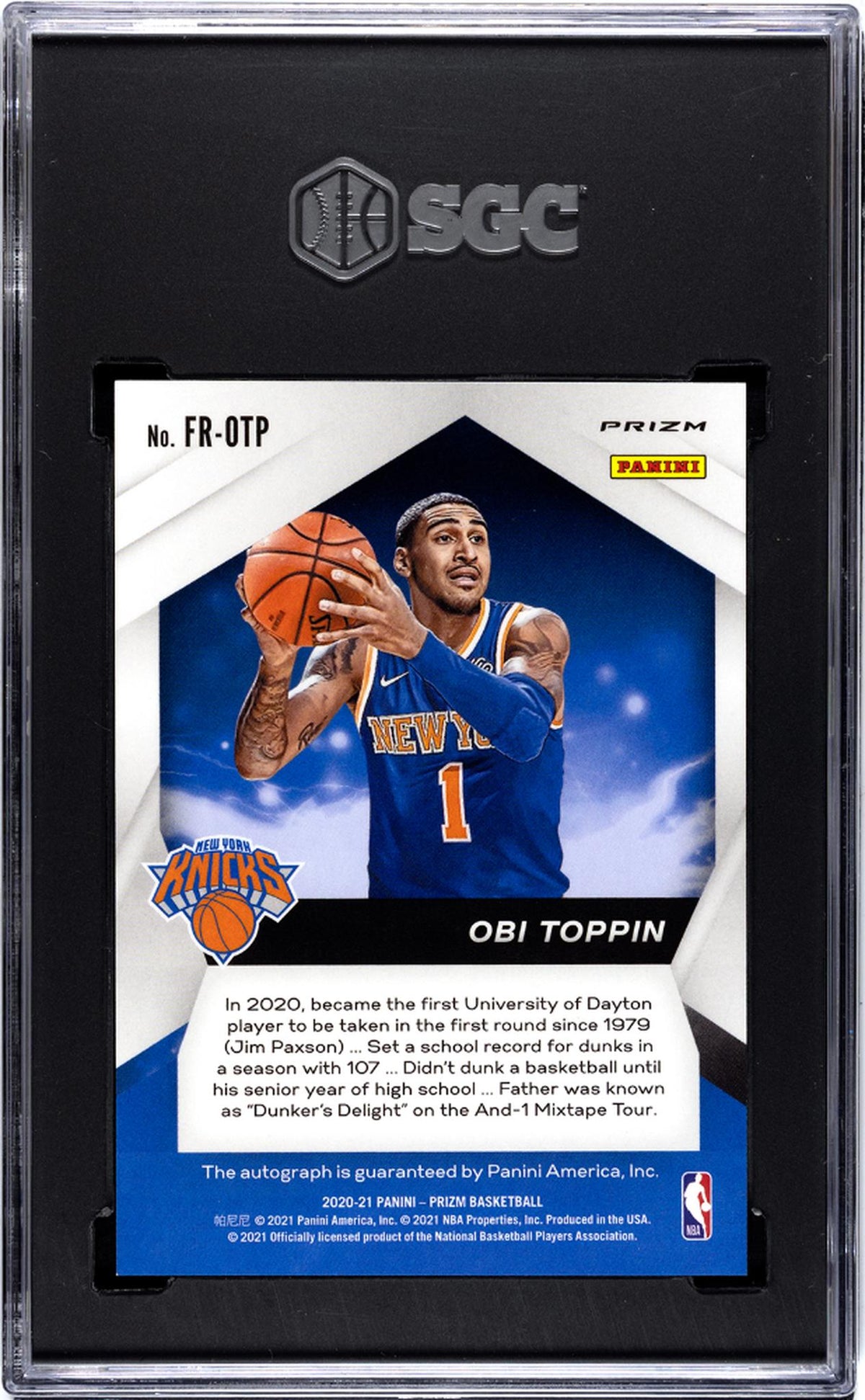 What's more, this card commemorates Obi Toppin's rookie year, making it a significant memento for any Knicks or Toppin fan. It's part of the 2020-21 Prizm Basketball set, a must-have for those serious about their basketball card collection.