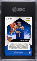 Introducing an absolute gem for sports card collectors and NBA fans alike - a truly spectacular 2020 Panini Prizm Fast Break rookie card of the sensational New York Knicks player, Obi Toppin. This exquisite card is not just any ordinary collectible, it boasts a coveted autograph from the player himself, making it a rare and desirable addition to any collection.