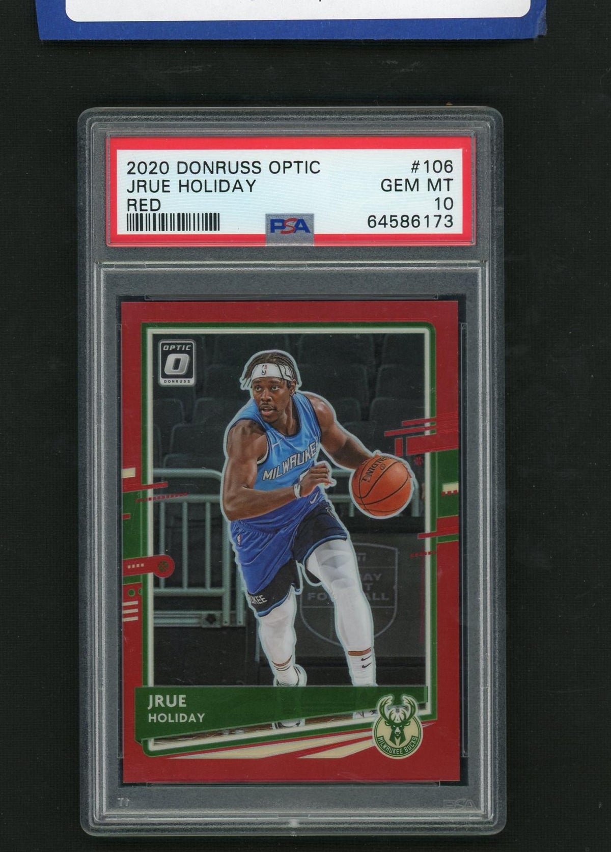 Step into the court with this magnificent 2020 Panini Donruss Optic Basketball card featuring the remarkable Jrue Holiday of the Milwaukee Bucks. An NBA enthusiast's dream come true, this card is not just a piece of memorabilia but a celebration of Holiday's commanding presence on the court. What makes this card a standout is its Red Parallel attribute, limited to just 99 copies worldwide. This is not just a card, but a scarce treasure with you owning the 33rd in the series. Emphasizing its rarity, it's not a rookie card but an emblem of Holiday's seasoned prowess and basketball acumen. Expertly graded by PSA, one of the most respected names in the card grading industry, it proudly bears a 10 - Gem Mint. This grade is a testament to this card's impeccable condition, which is as flawless and pristine as Holiday's game-winning strategies. This card perfectly embodies the Donruss Optic brand's commitment to quality and the excitement of the sport. It's a tangible piece of the NBA, a token of love for the Milwaukee Bucks, and a tribute to the undeniably talented Jrue Holiday. This is more than just a card; it's a valuable addition to any sports card collection and a fantastic way to celebrate your love for basketball. Proudly showcase your passion for the sport with this stunning Jrue Holiday card. It's not just a purchase; it's an investment in a piece of basketball history. Secure your piece of the action today with this exceptional sports card.