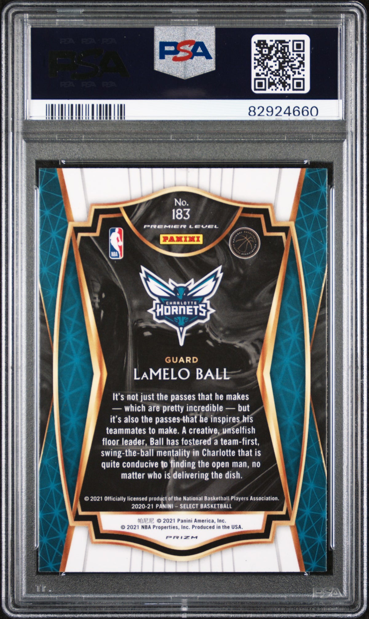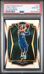 This exquisite 2020 Panini Select LaMelo Ball Silver Rookie Card #183 PSA 10 RC is a must-have for any serious card collector. It encapsulates the prestige of Panini Select, a brand known for its high-quality, top-tier cards. Featuring the supremely talented LaMelo Ball in his rookie year, this card captures a pivotal moment in sports history. The card is in pristine PSA 10 condition, testifying to its flawless integrity and perfect finish. The Silver Edition of the card adds a layer of desirability and exclusivity, making it a significant addition to any collection. This card is more than just a collectible, it's a tribute to LaMelo Ball's rookie year, encapsulating his dynamic energy and promising career ahead. The card's number, 183, adds to its uniqueness and collectability. This card is not just an asset, but a piece of sports history that continues to appreciate over time. It's an absolute gem for those who appreciate the art of sports and the thrilling world of card collecting. Don't miss out on this opportunity to own this magnificent piece of sporting memorabilia.