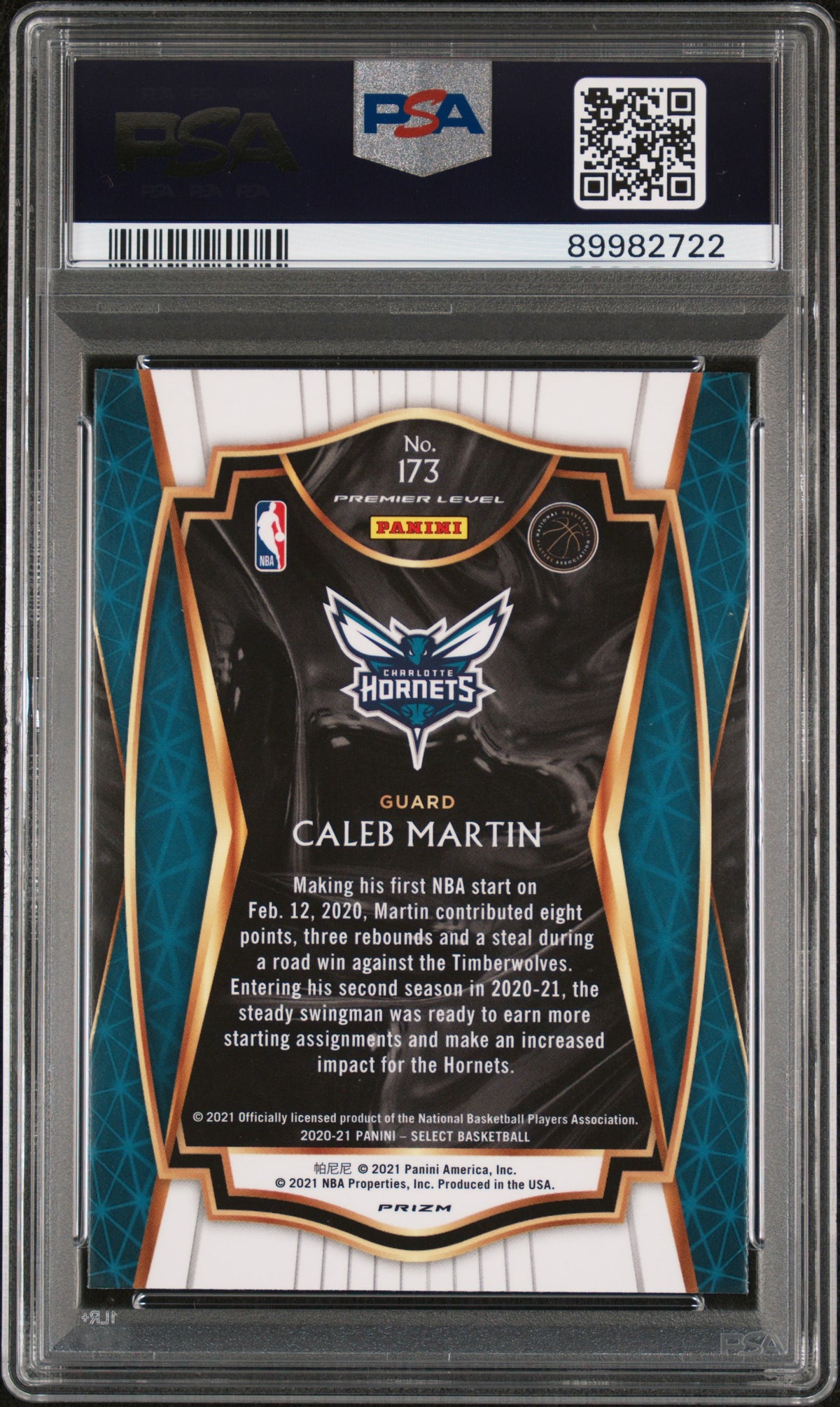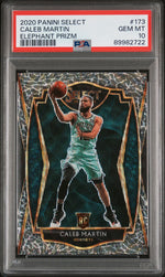 Key features of this card include the Elephant Prizm design, Caleb Martin as the featured player, PSA Gem MT 10 grading, its status as a rookie card, its affiliation with the Hornets team and the NBA league, and its inclusion in the Select 2020 Parallel set.