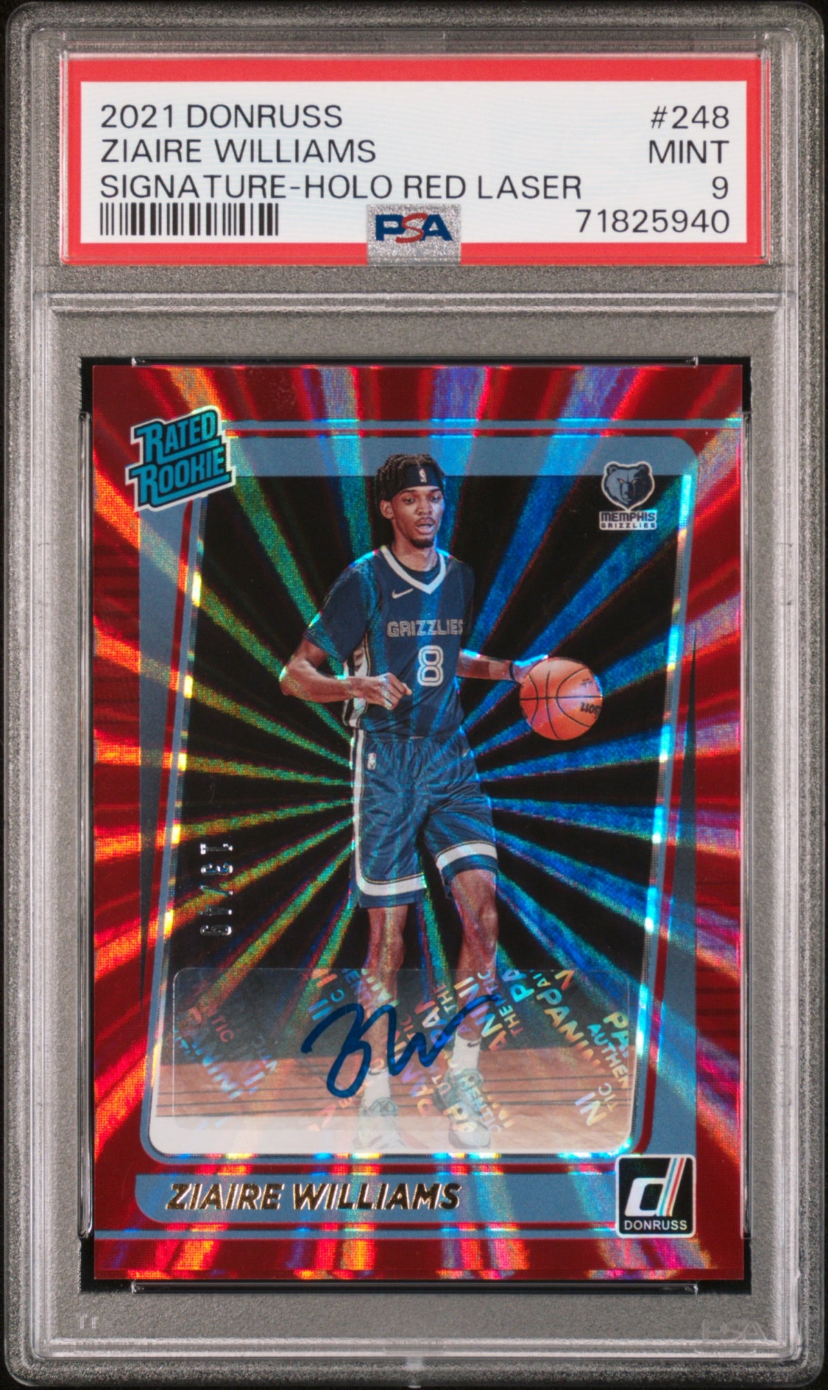 Immerse yourself in the world of basketball with this exceptional 2021 Donruss #248 Ziaire Williams card! Manufactured by Panini, an industry leader in sports memorabilia, this card is a part of the esteemed Donruss series and is a rare find with its unique 'Signature-Holo Red Laser' insert set.