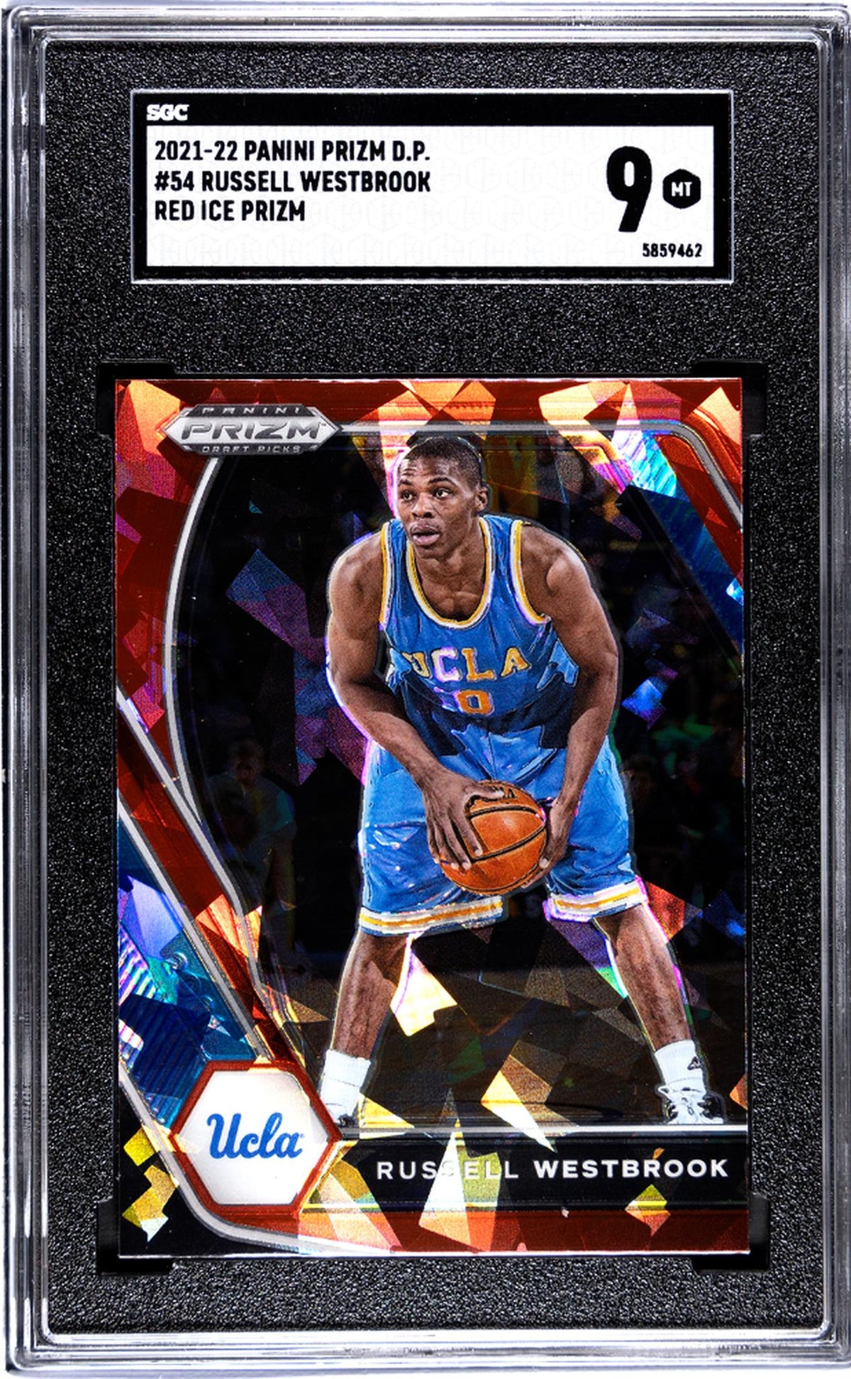 Immerse yourself in the world of basketball card collecting with this extraordinary 2021 Prizm 54 Russell Westbrook card, brought to you by the renowned manufacturer, Panini. This card is a part of the sought-after Prizm Draft Picks set and features the Red Ice Prizm parallel, making it a standout addition to any collection.