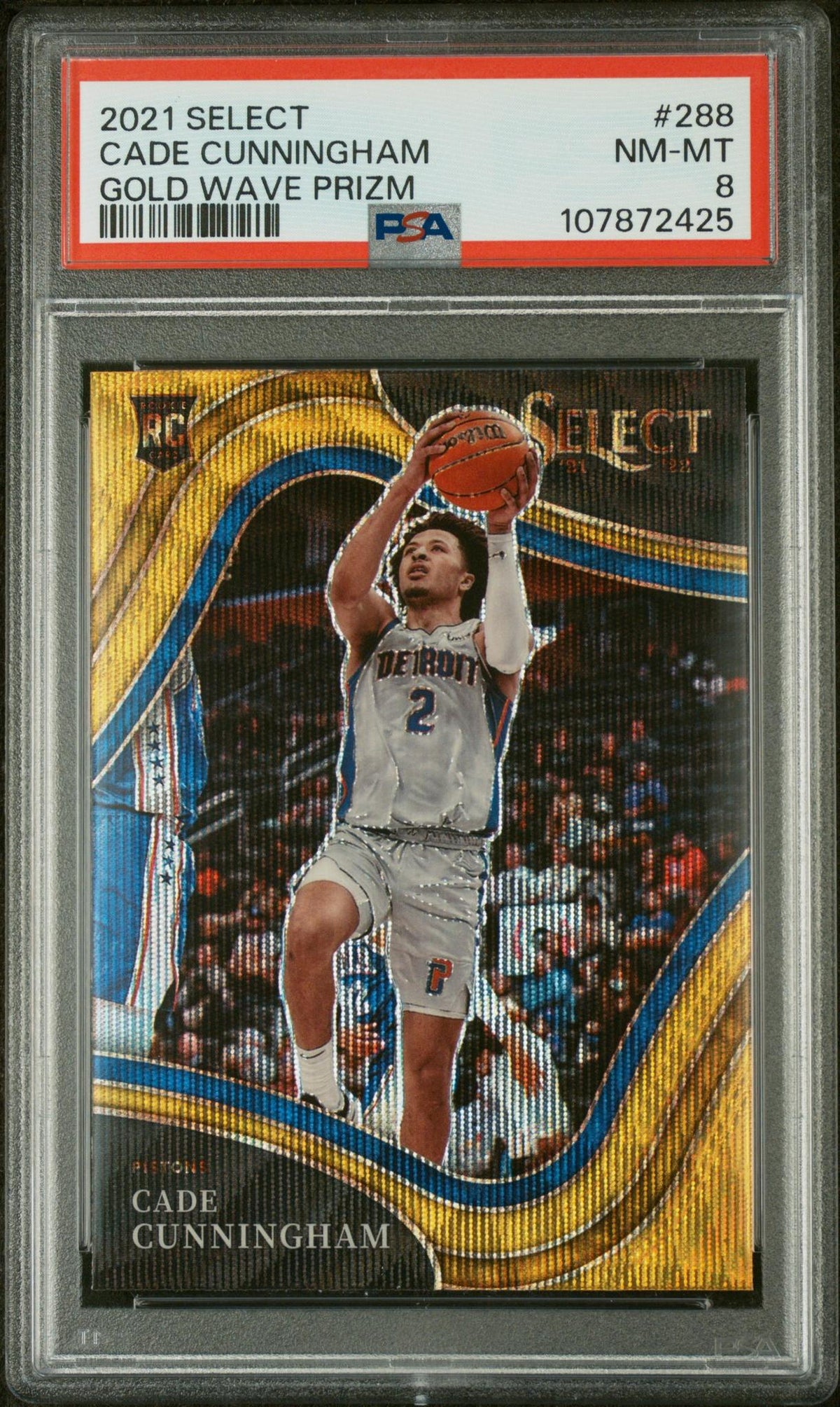 Behold the gem of your sports card collection - the 2021 Panini Select #288 Cade Cunningham Gold Wave Prizm card. This card is a true treasure for collectors and NBA fans alike, featuring the highly sought-after Cade Cunningham, a rising star of the Detroit Pistons.