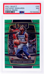 Feast your eyes on this incredible 2021 Panini Select Concourse Green Prizm Anthony Edwards #49 /5 PSA 7. This card is an absolute gem, a must-have for any serious collector. Known for their quality and attention to detail, Panini Select has outdone themselves with this card. The stunning green prizm design adds a touch of sophistication and luxury, making it a standout piece in any collection.