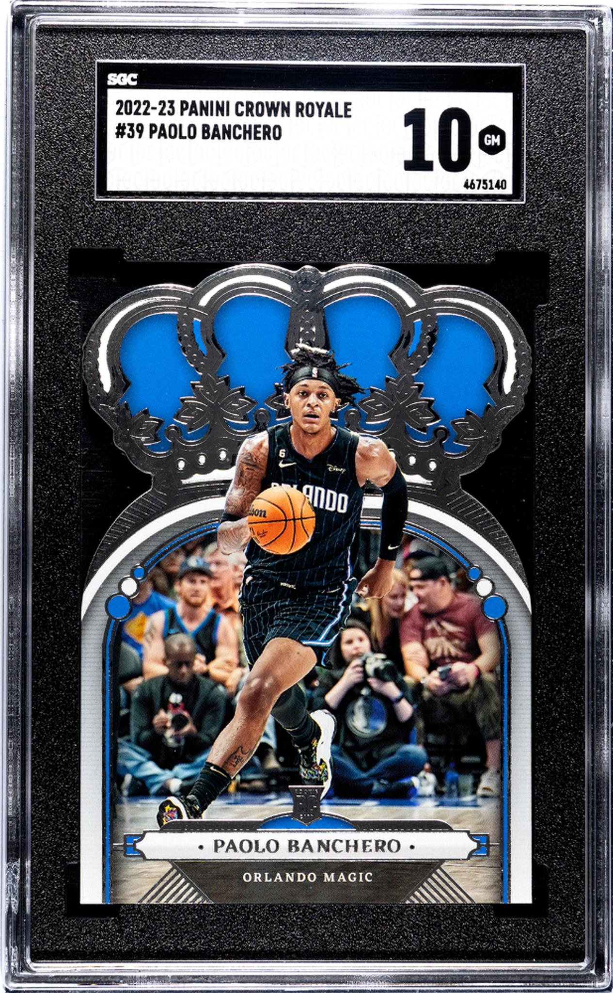 The card, from renowned manufacturer Panini's Crown Royale set, is a testament to Banchero's burgeoning career. Its unique design, coupled with its immaculate condition, makes it a standout piece in any collection. The card has been professionally graded by SGC, a trusted name in the industry, and has achieved the prestigious 'Gem Mint' status with a perfect score of 10. This denotes the card's flawless condition, enhancing its value for years to come.
