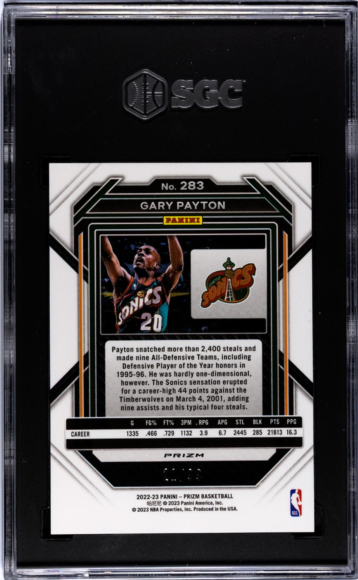 Unveil the sporting history with this remarkable Gary Payton sports card, from the esteemed manufacturer, Panini. This card hails from the Prizm brand, a series that has quickly become a favorite amongst both seasoned and new collectors.