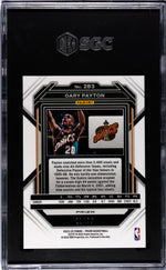 The key features of this card include its rare Purple Prizm parallel, SGC graded 9.5 Mint+ condition, serial numbered 21/99 status, featuring of NBA legend Gary Payton, and its place in the Panini Prizm 2022-23 series.