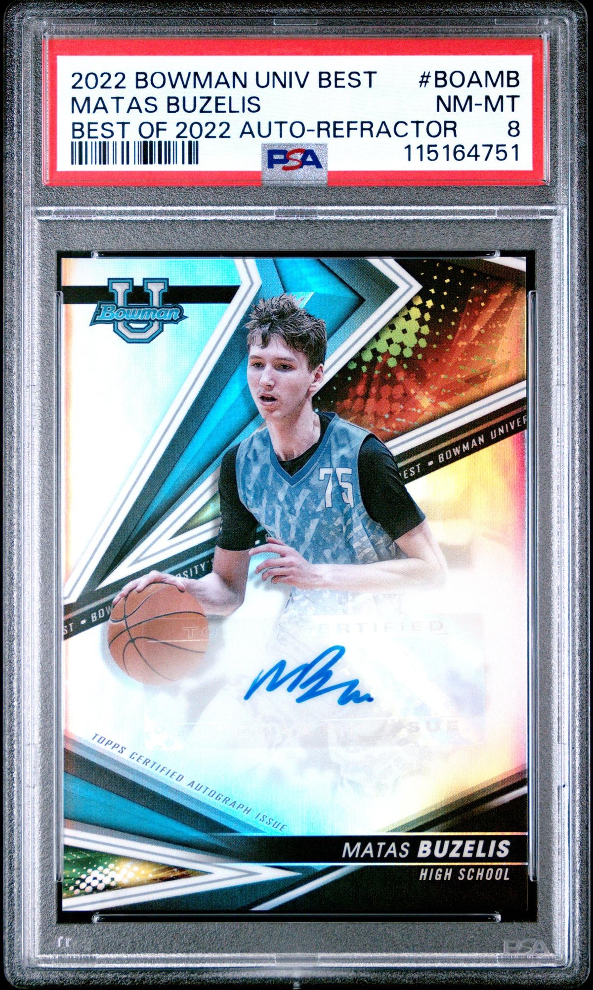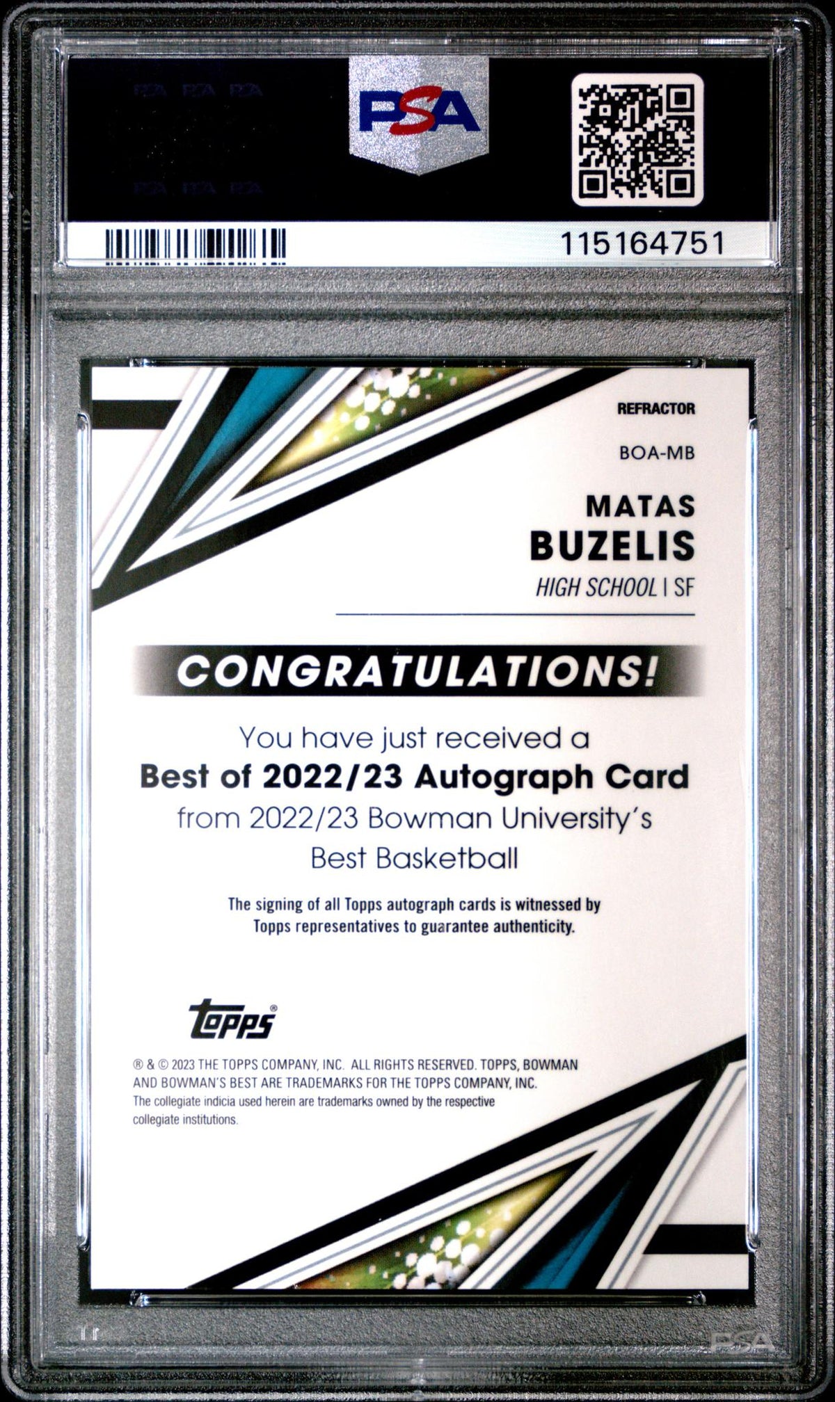 Boasting an authentic autograph from the High School basketball sensation, Matas Buzelis, the card adds a personal touch that amplifies its value and appeal. This card is part of the exclusive 'Best of 2022 Auto-Refractor' insert set, making it a prime piece for those seeking to complete their collection.