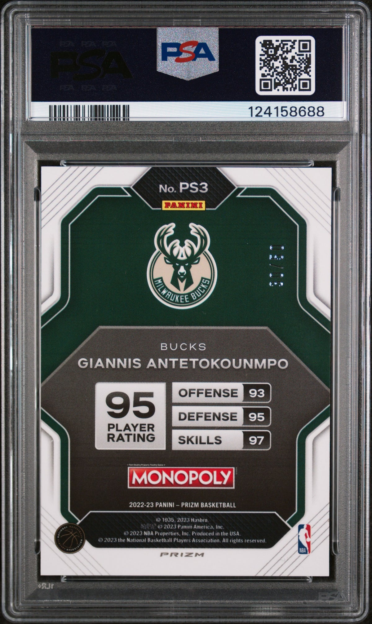 Presenting the extraordinary 2022 Panini Prizm PS3 Giannis Antetokounmpo Monopoly card. This is a truly remarkable piece of basketball memorabilia and a must-have for any serious collector or Milwaukee Bucks fan. Manufactured by the esteemed Panini company, the card features a stunning Purple Money Shim parallel design, enhancing its visual appeal and rarity.