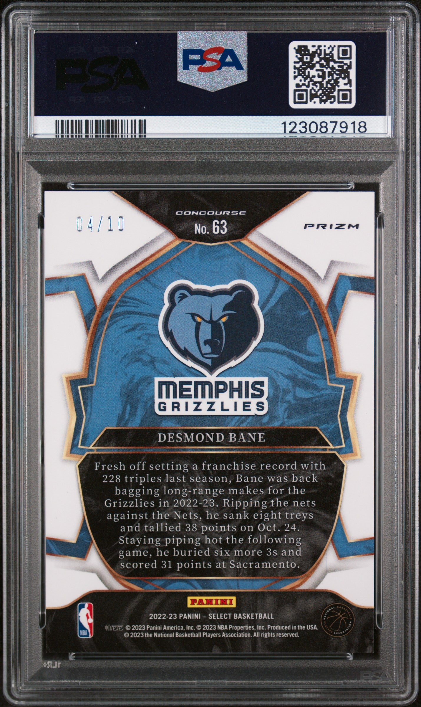 In conclusion, the 2022 Select #63 Desmond Bane Gold Cracked Ice card is a stunning piece of sports memorabilia. Its rarity, exceptional condition, and the athlete it represents make it a must-have for any collector. This card is more than just a piece of cardboard; it's a piece of basketball history.