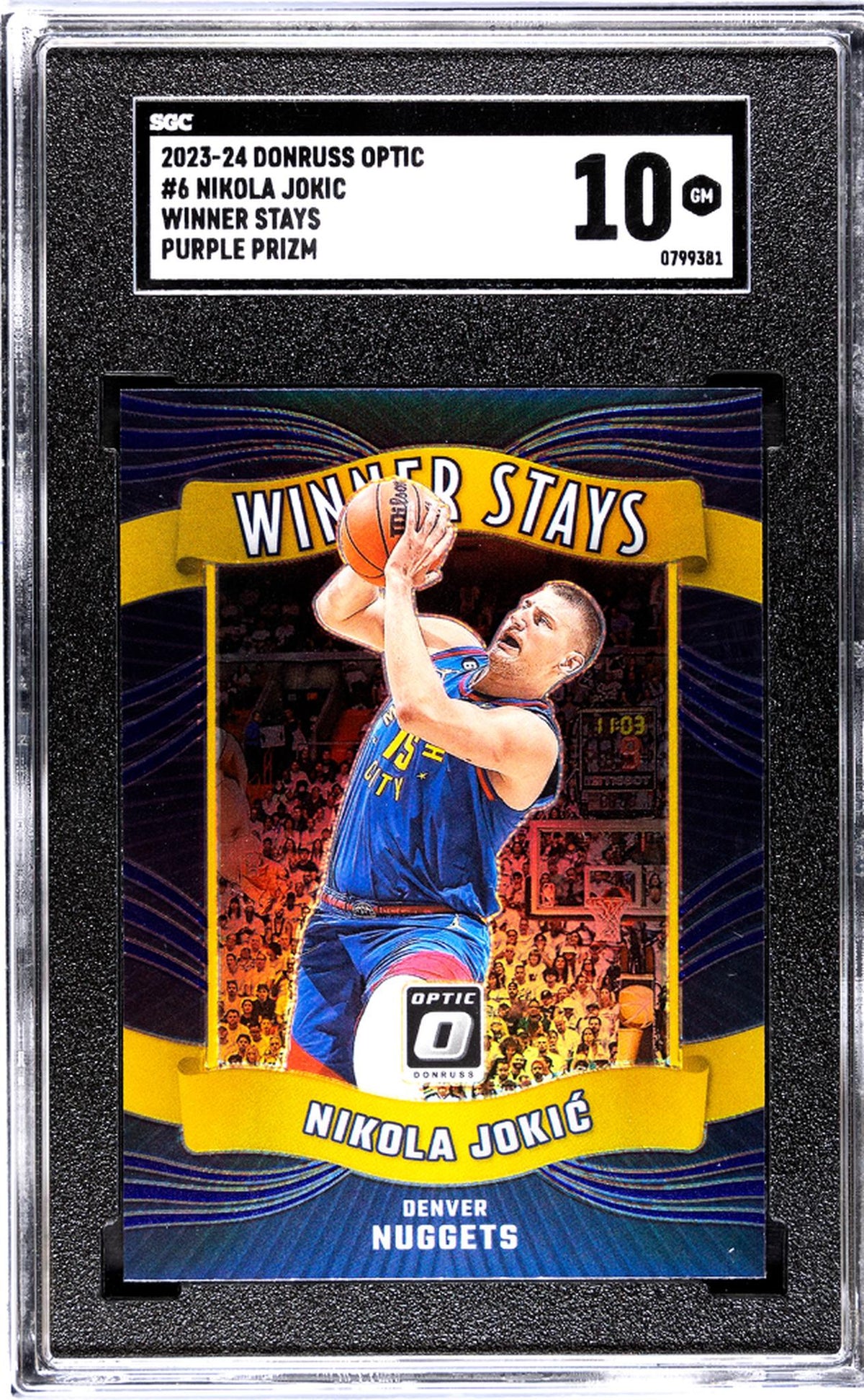 The card also belongs to the highly-respected Panini Donruss Optic Winner Stays set. This set is known for its exceptional quality and the impressive roster of players it features. This Nikola Jokic card, with its distinctive 'Winner Stays' badge and eye-catching Purple Prizm parallel, is a standout even among this elite collection.