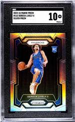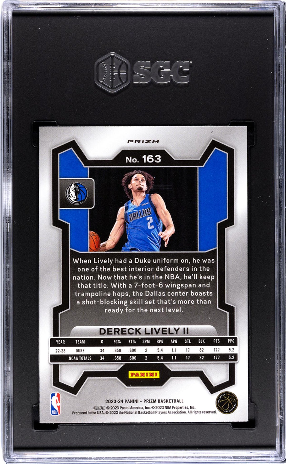 Key features include the fact that it's a rookie card, it's from the Silver Prizm parallel set, it's in Gem Mint SGC 10 condition, and it features Dereck Lively II of the Dallas Mavericks from the NBA 2023-24 Panini Prizm set.