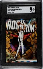 Immerse yourself in the thrill of the game with this exquisite 2023-24 Panini Recon Rock the Rim Basketball card featuring the remarkable talents of Victor Wembanyama. The card, brilliantly representing the San Antonio Spurs stalwart, is a limited-edition, numbered 3 out of 25, making it a rare gem for any collector's treasure box.