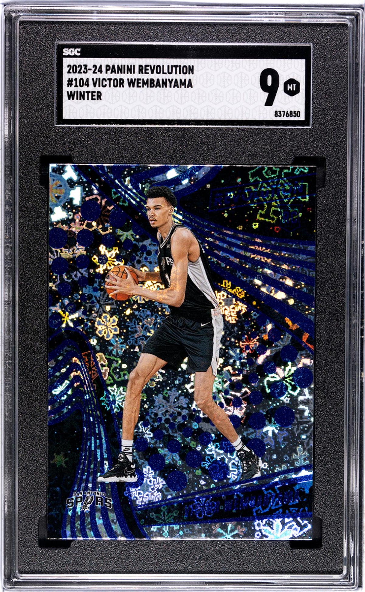 Behold, the striking 2023-24 Victor Wembanyama Rookie Card from the esteemed Panini's Revolution set! This eye-catching gem is a must-have for any serious NBA card collector. Hailing from the Winter Insert Set, this card is adorned with an impressive design that perfectly captures the essence of the basketball season.