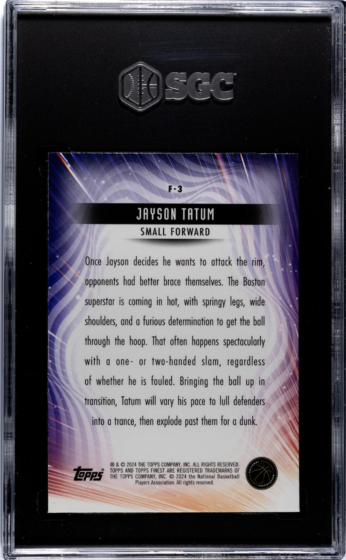 Step into the winner's circle with this impeccably graded gem mint 2023-24 Topps Finest F-3 Jayson Tatum sports card. This sleek, high-quality card showcases one of the NBA's top talents, Jayson Tatum of the Boston Celtics, in a way that is sure to impress any basketball enthusiast or avid collector.