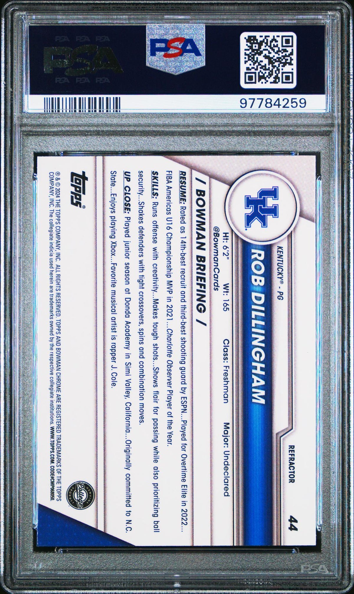 In essence, this Rob Dillingham rookie card is more than just a collectible - it's a piece of sports history. The refractor finish enhances its visual appeal, making it a standout piece in any collection. Its Gem Mint condition ensures its lasting value, making it a worthy investment. Add this card to your collection and celebrate the remarkable journey of Rob Dillingham in the world of basketball. Don't miss out on the opportunity to own this impeccable piece of sports memorabilia!