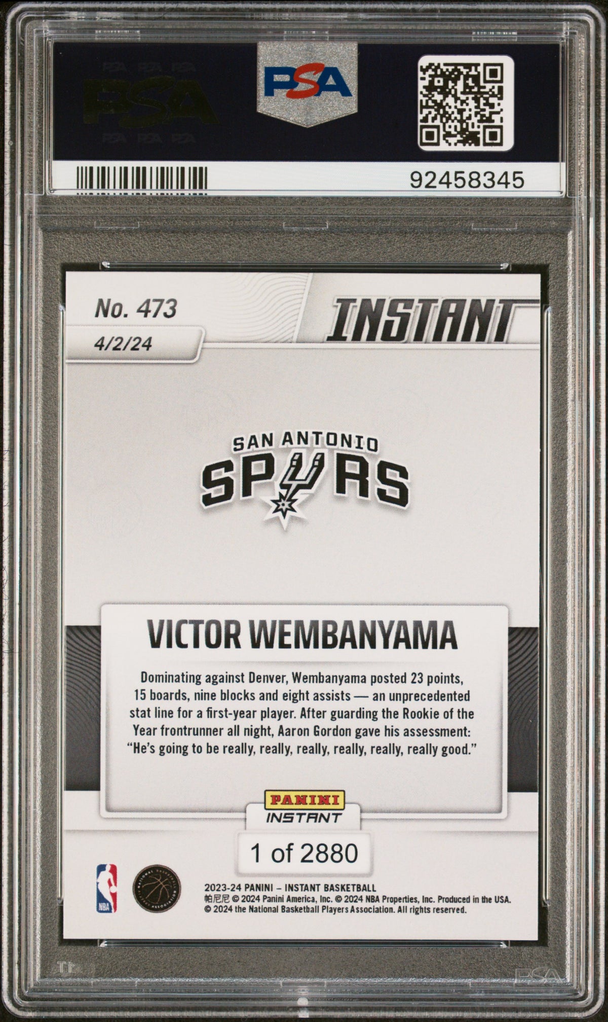 Overall, this 2023 Instant #473 Wembanyama PSA 10 card is more than just a collectible item, it's a piece of sports history, a testament to Wembanyama's promising career and a symbol of Panini's commitment to quality. Perfect for basketball enthusiasts, sports memorabilia collectors, or anyone who values rare, high-quality collectibles.
