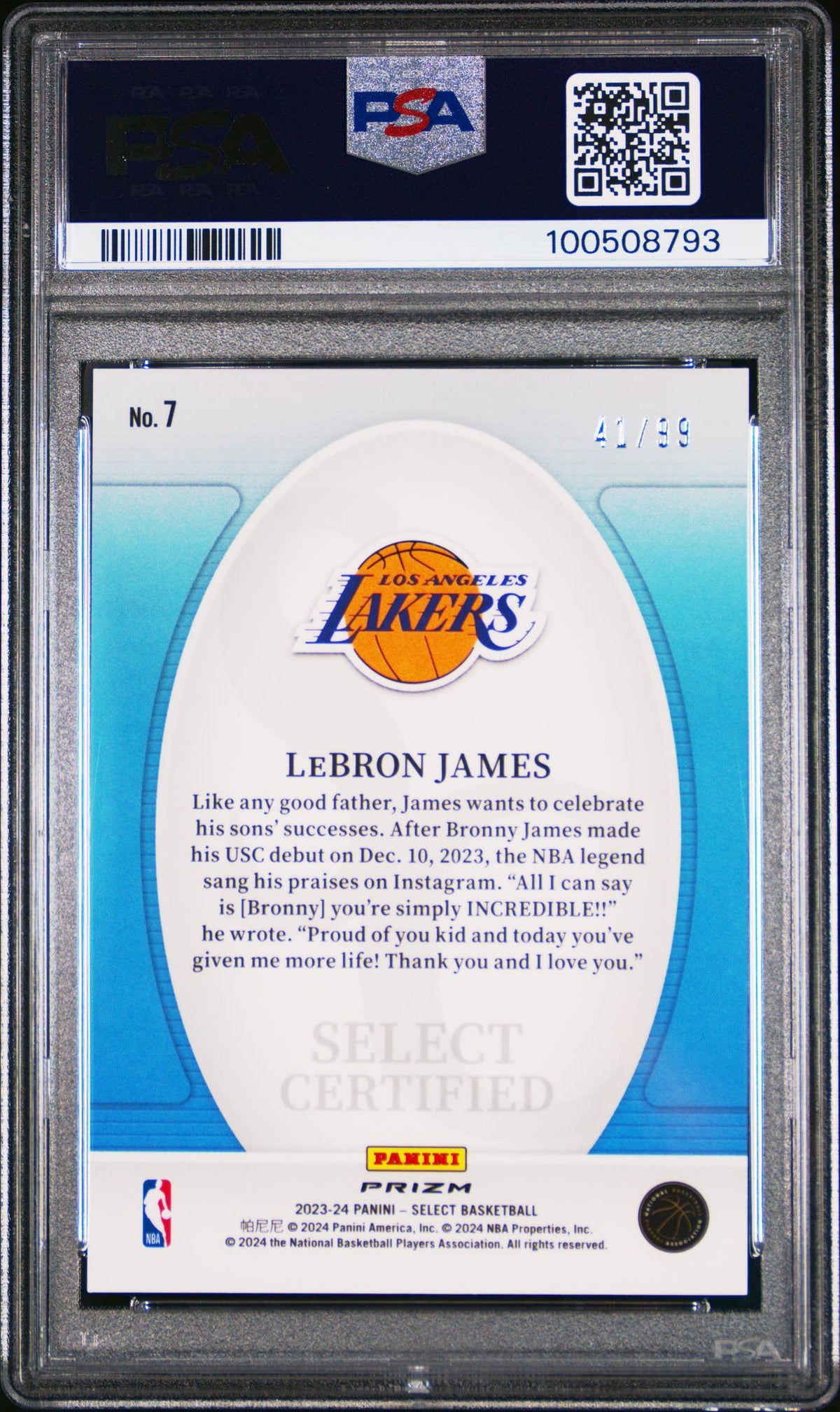 Intricately crafted by top-notch manufacturer Panini, this card is from the esteemed Prizm brand and is a select certified insert from the NBA Select Certified set. It stands out as a shining testament to LeBron's remarkable NBA journey.